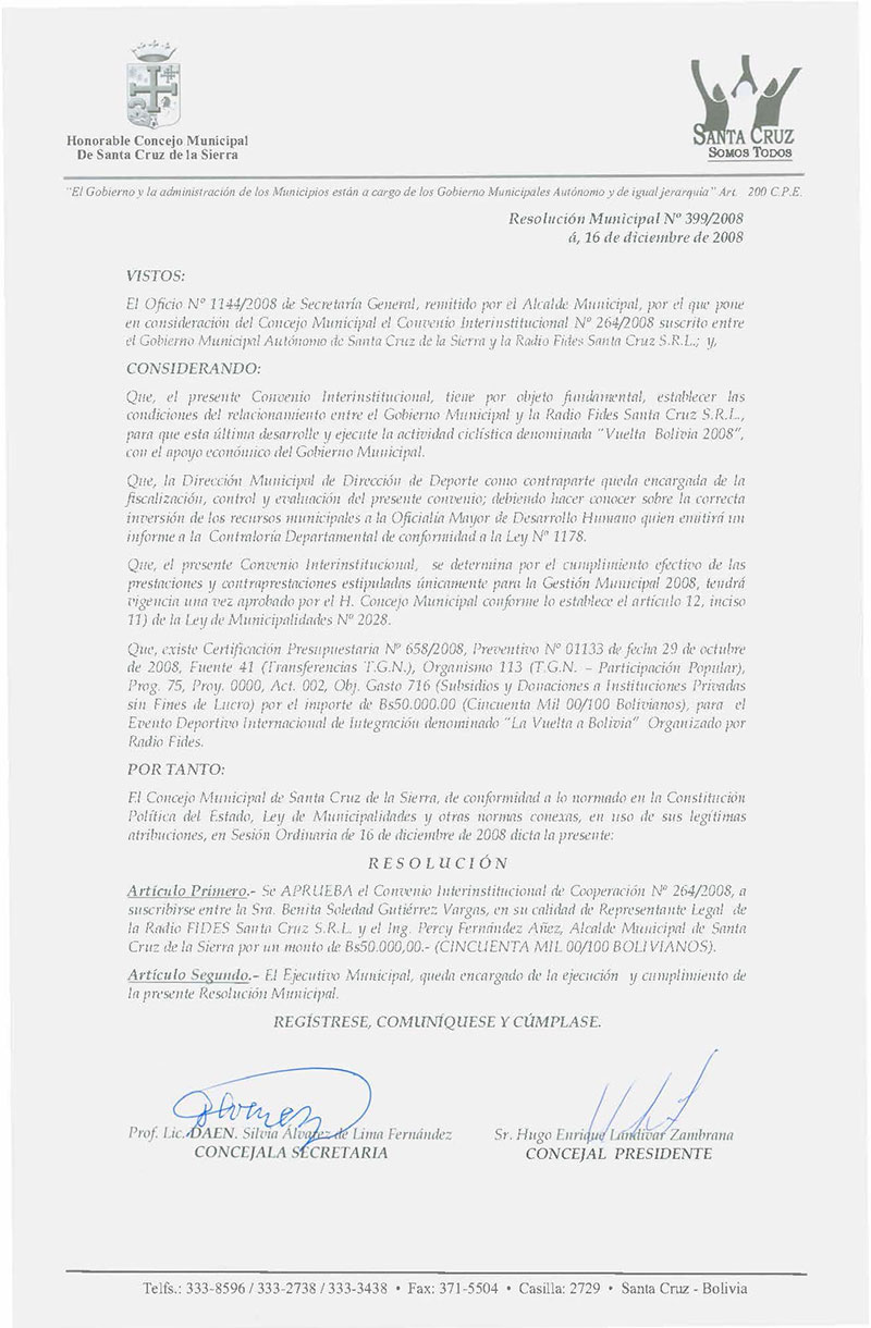 Aprueba el Convenio Interinstitucional de Cooperación Nº 264/2008, a suscribirse entre la Radio FIDES Santa Cruz S.R.L. y Gobierno Municipal de Santa Cruz por un monto de Bs. 50.000,00.- (CINCUENTA MIL 00/100 BOLIVIANOS).