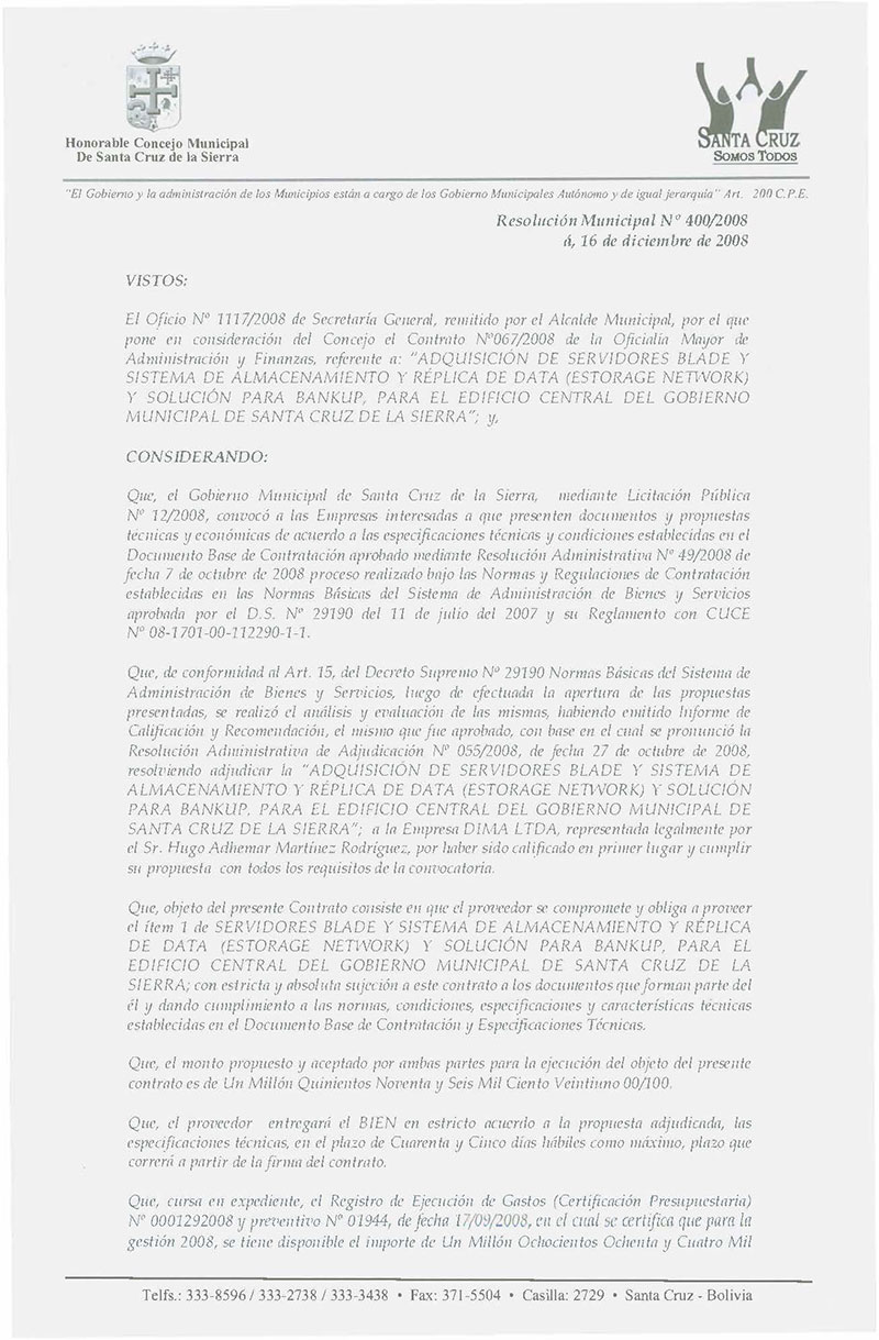 Aprueba el Contrato Nº 067/2008 de la Oficialía Mayor de Administración y Finanzas, referente a la: “ADQUISICIÓN DE SERVIDORES BLADE Y SISTEMA DE ALMACENAMIENTO Y RÉPLICA DE DATA (ESTORAGE NETWORK) Y SOLUCIÓN PARA BANKUP, PARA EL EDIFICIO CENTRAL DEL GOBIERNO MUNICIPAL DE SANTA CRUZ DE LA SIERRA”, adjudicado a la “Empresa DIMA LTDA”, por un monto de Bs. 1.596.121,00 (UN MILLÓN QUINIENTOS NOVENTA Y SEIS MIL CIENTO VEINTIUNO 00/100).
