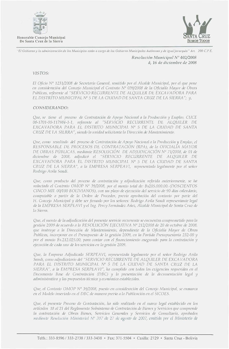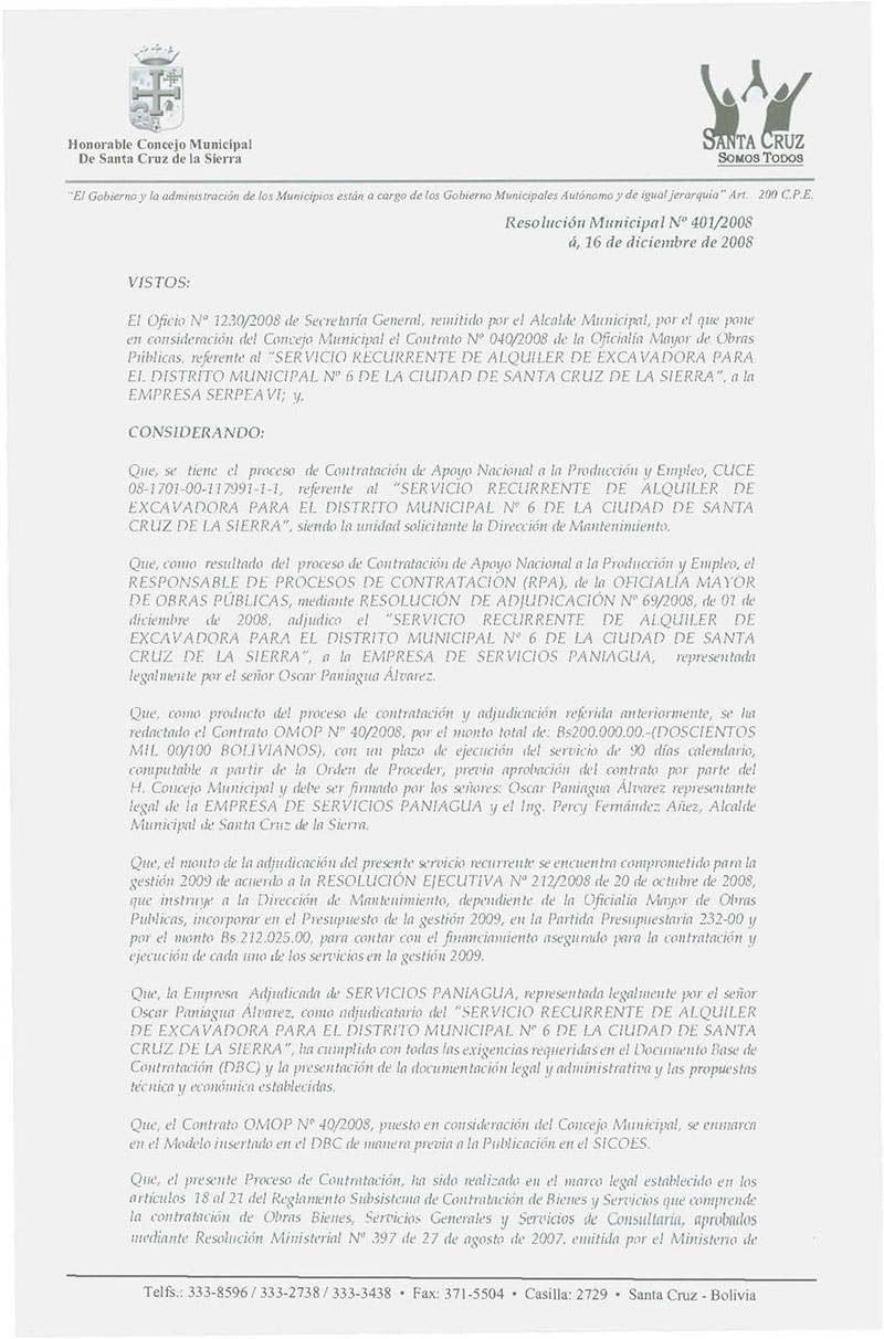 Aprueba el Contrato Nº 40/2008 de la Oficialía Mayor de Obras Públicas, por el monto total de Bs. 200.000.00.-(DOSCIENTOS MIL 00/100 BOLIVIANOS), para el “SERVICIO RECURRENTE DE ALQUILER DE UNA EXCAVADORA POR 500 HRS. PARA EL DISTRITO MUNICIPAL Nº 6 DE LA CIUDAD DE SANTA CRUZ DE LA SIERRA”, a suscribirse con la EMPRESA DE SERVICIOS PANIAGUA.
