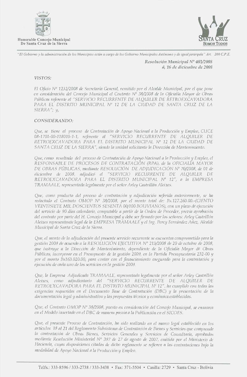 Aprueba el Contrato Nº 38/2008 de la Oficialía Mayor de Obras Públicas, por el monto total de Bs. 127.260.00.-(CIENTO VEINTISIETE MIL DOSCIENTOS SESENTA 00/100 BOLIVIANOS), para el “SERVICIO RECURRENTE DE ALQUILER DE UNA RETROEXCAVADORA POR 600 HRS. PARA EL DISTRITO MUNICIPAL Nº 12”, a suscribirse con la EMPRESA TRAMAALE.