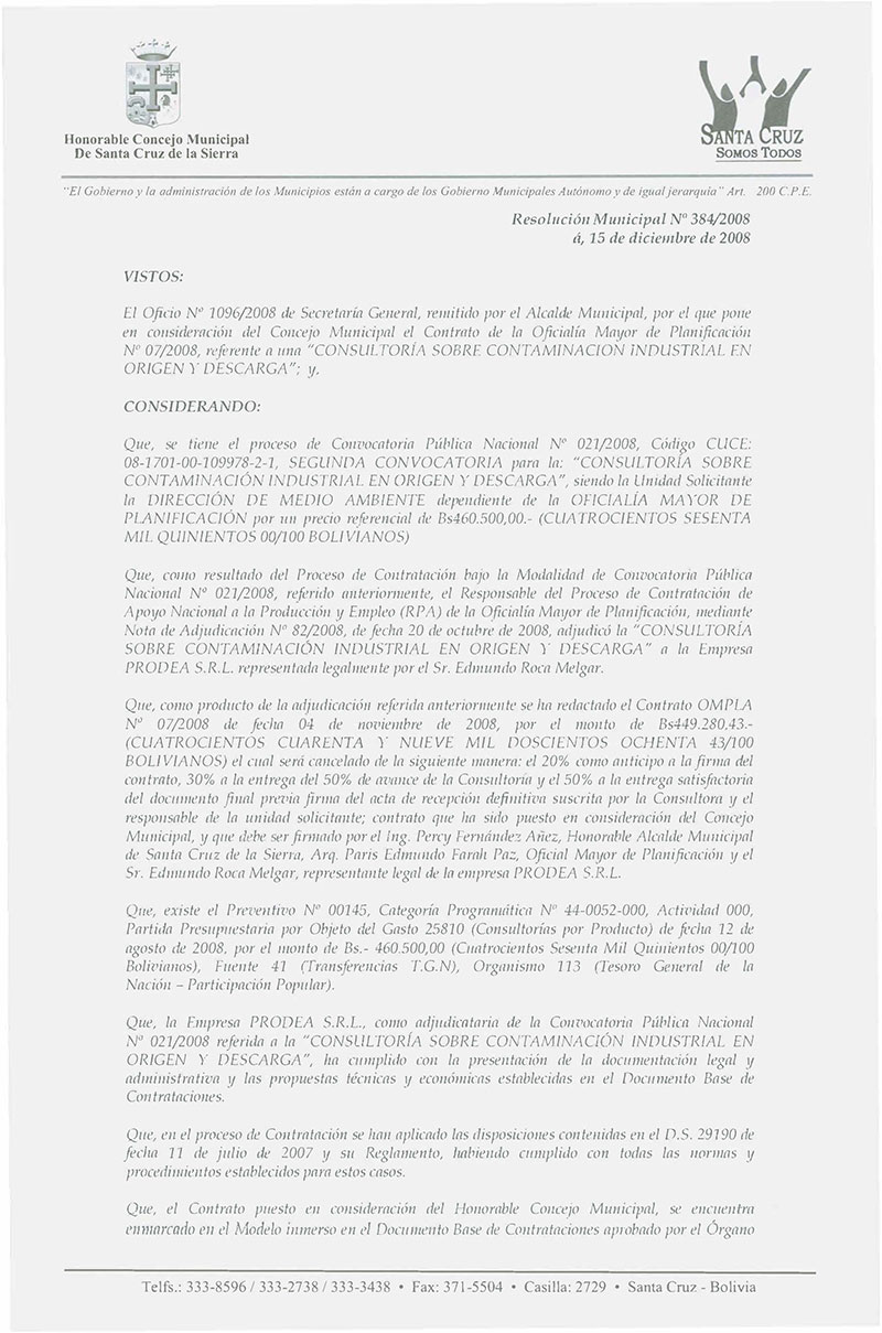 Aprueba el Contrato de la Oficialía Mayor de Planificación N° 07/2008, por el valor de Bs. 449.280,43.- (CUATROCIENTOS CUARENTA Y NUEVE MIL DOSCIENTOS OCHENTA 43/100 BOLIVIANOS), para la “CONSULTORÍA SOBRE CONTAMINACIÓN INDUSTRIAL EN ORIGEN Y DESCARGA”, adjudicado a la Empresa Proyectos de Desarrollo y Equidad Ambiental - PRODEA S.R.L.