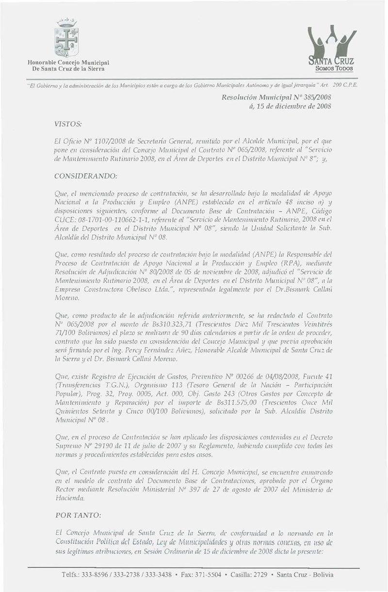 Aprueba el Contrato Nº 65/2008 de 12 de noviembre de 2008, por el monto de Bs. 310.323,71.- (TRESCIENTOS DIEZ MIL TRESCIENTOS VEINTITRÉS 71/100 BOLIVIANOS), para el “SERVICIOS DE MANTENIMIENTO RUTINARIO 2008, EN EL ÁREA DE DEPORTES EN EL DISTRITO MUNICIPAL Nº 8” adjudicado a la EMPRESA CONSTRUCTORA OBELISCO LTDA.