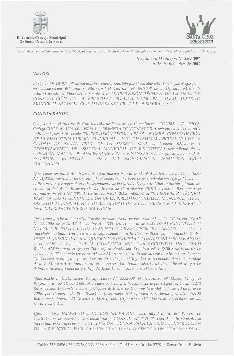 Aprueba el Contrato N° 55/2008 de la Oficialía Mayor de Administración y Finanzas de 17 de octubre de 2008, por el valor de Bs. 59.985,90.- (CINCUENTA Y NUEVE MIL NOVECIENTOS OCHENTA Y CINCO 90/100 BOLIVIANOS), para la “SUPERVISIÓN TÉCNICA PARA LA OBRA DE CONSTRUCCIÓN DE LA BIBLIOTECA PÚBLICA MUNICIPAL, UV-31, DISTRITO MUNICIPAL Nº 1 DE LA CIUDAD DE SANTA CRUZ DE LA SIERRA” adjudicado al Ing. WILFREDO TERCEROS SALVADOR.