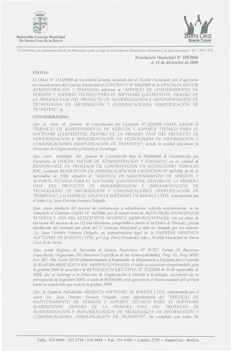 Aprueba el Contrato Nº 66/2008 de la OFICIALÍA MAYOR ADMINISTRACIÓN Y FINANZAS, por el monto total de Bs. 276.790.00.-(DOSCIENTOS SETENTA Y SEIS MIL SETECIENTOS NOVENTA 00/100 BOLIVIANOS), para el “SERVICIO DE MANTENIMIENTO DE VERSIÓN Y SOPORTE TÉCNICO PARA EL SOFTWARE Q-EXPEDITIVE, DENTRO DE LA PRIMERA FASE DEL PROYECTO DE MODERNIZACIÓN E IMPLEMENTACIÓN DE TECNOLOGÍAS DE INFORMACIÓN Y COMUNICACIONES (SIMPLIFICACIÓN DE TRÁMITES)”, adjudicada a la EMPRESA URUDATA SOFTWARE DE BOLIVIA LTDA.