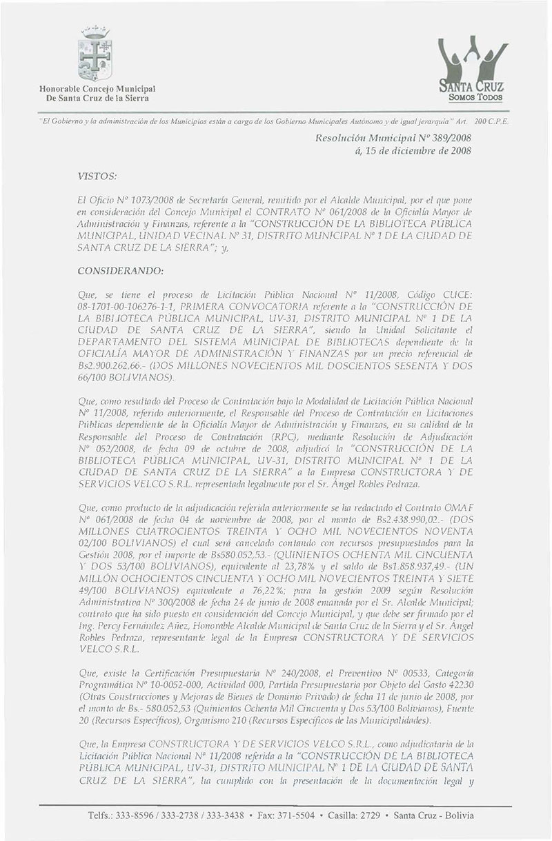 Aprueba el Contrato N° 061/2008 de la Oficialía Mayor de Administración y Finanzas, por el valor de Bs. 2.438.990,02.- (DOS MILLONES CUATROCIENTOS TREINTA Y OCHO MIL NOVECIENTOS NOVENTA 02/100 BOLIVIANOS), para "CONSTRUCCIÓN DE LA BIBLIOTECA PÚBLICA MUNICIPAL UV-31 DISTRITO MUNICIPAL N° 1, adjudicado a la Empresa CONSTRUCTORA Y DE SERVICIOS VELCO S.R.L.