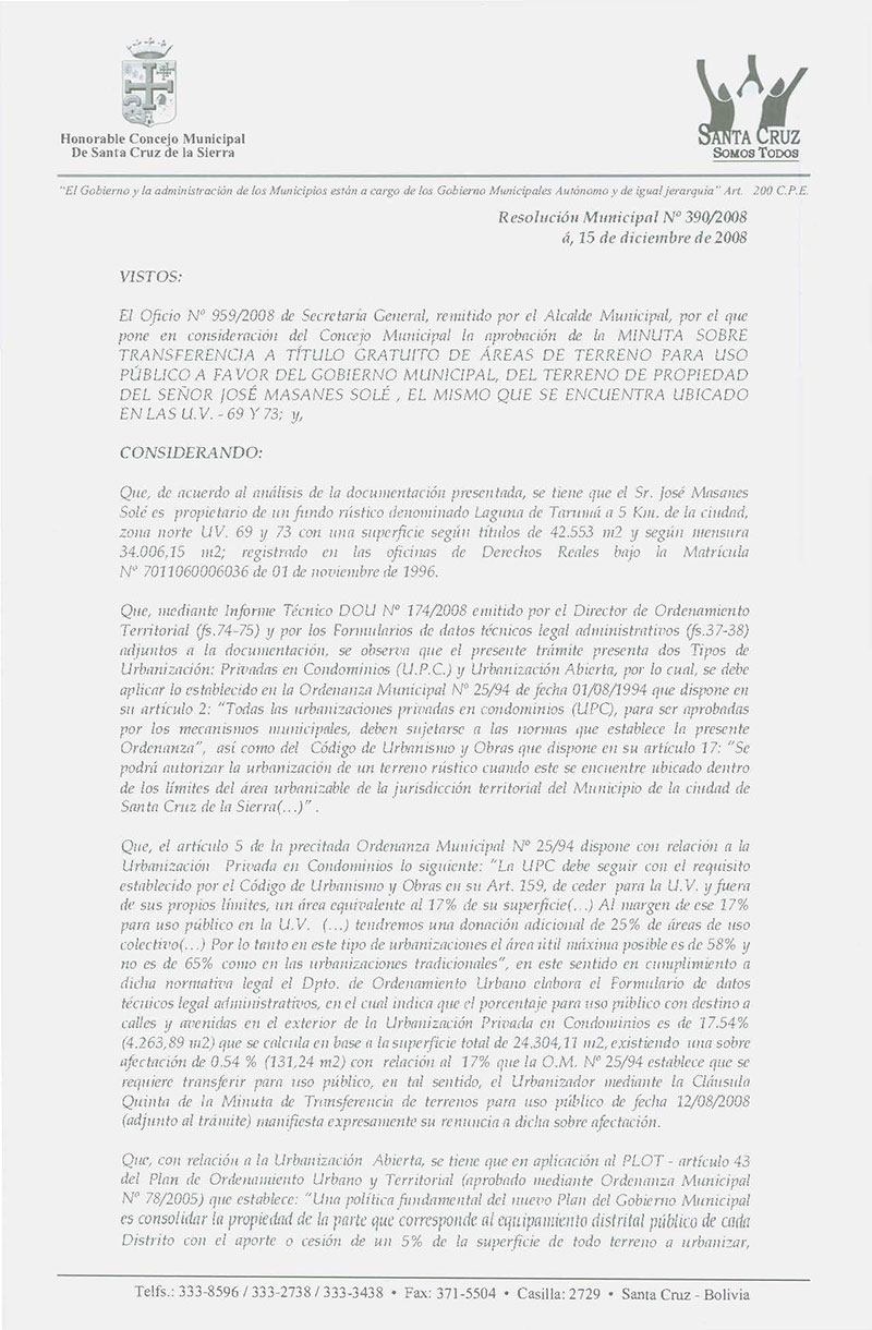 APRUEBA la “MINUTA DE TRANSFERENCIA A TÍTULO GRATUITO DE CESIÓN DE ÁREA”, que realiza el Sr. José Masanes Sole, a favor del Gobierno Municipal de Santa Cruz de la Sierra, situado en la Provincia Andrés Ibáñez denominado Laguna de Tarumá a 5 Km de la ciudad, el terreno cuenta con una superficie según título de 42.553 m2 y según mensura de 34.006,15 m2., de los cuales para la Urbanización Privada en Condomio 4.263.89 m2 equivalente al 17.54% y para Urbanización Abierta 5.890.22 m2 equivalente al 60.71%, haciendo un total para uso público de 10.154,11m2 .