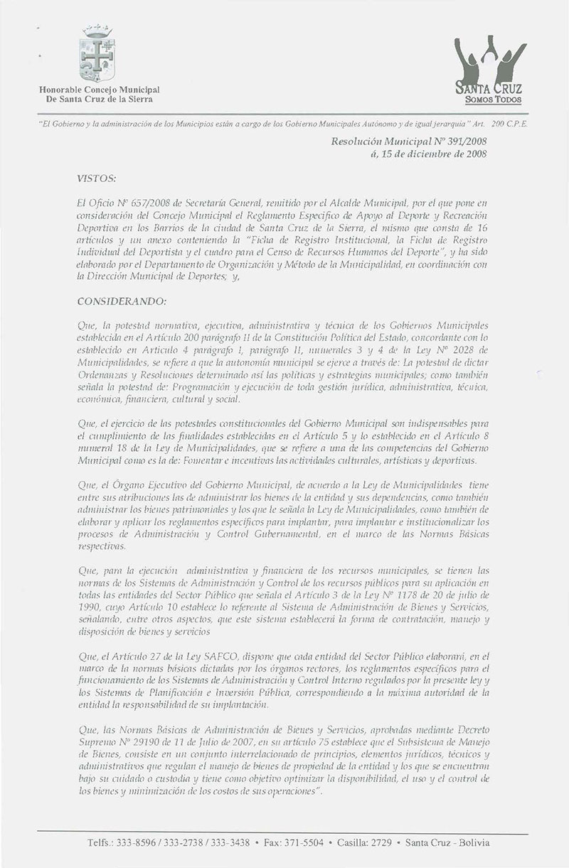 Aprueba el “Reglamento Específico de Apoyo al Deporte y Recreación Deportiva en los Barrios de la ciudad de Santa Cruz de la Sierra” en sus Seis (6) Capítulos, sus Dieciséis (16) Artículos y sus Tres (3) Formularios como anexos.