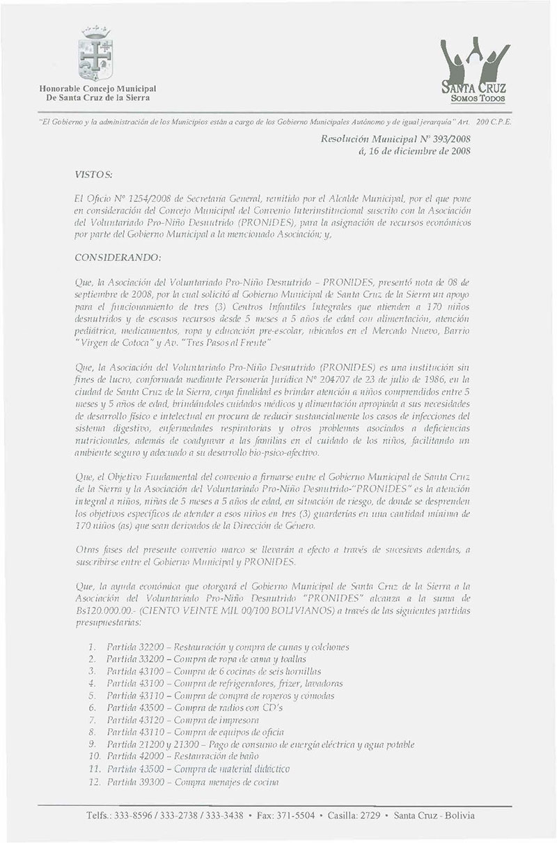 Aprueba el Convenio Marco de Cooperación entre el Gobierno Municipal de Santa Cruz de la Sierra y la Asociación del Voluntariado Pro-Niño Desnutrido “PRONIDES”, asignandose recursos para la presente gestión 2008 por el monto de Bs. 120.000.00.- (CIENTO VEINTE MIL 00/100 BOLIVIANOS).