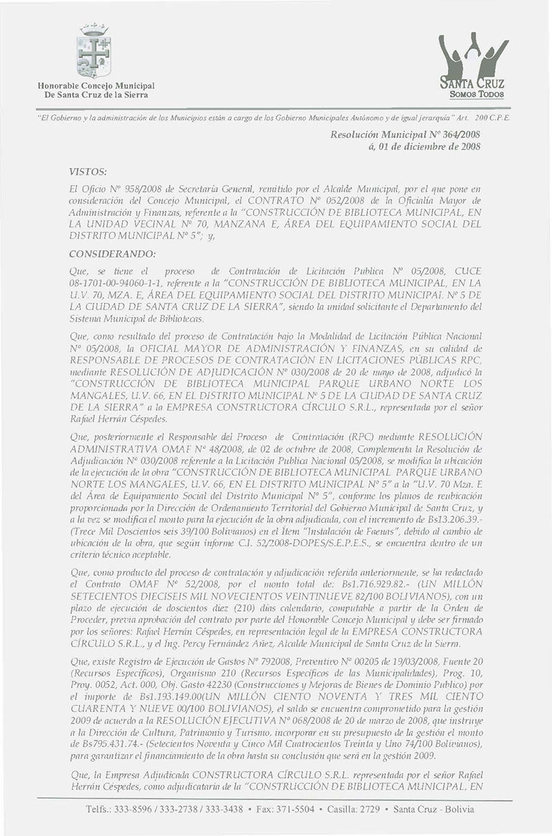 Aprueba el Contrato Nº 052/2008 de la Oficialía Mayor de Administración y Finanzas, por el monto total de Bs. 1.716.929.82 (UN MILLÓN SETECIENTOS DIECISÉIS MIL NOVECIENTOS VEINTINUEVE 82/100 BOLIVIANOS), para la “CONSTRUCCIÓN DE BIBLIOTECA MUNICIPAL, EN LA UNIDAD VECINAL Nº 70, MANZANA E, ÁREA DEL EQUIPAMIENTO SOCIAL DEL DISTRITO MUNICIPAL Nº 5”, a suscribirse con la EMPRESA CONSTRUCTORA CÍRCULO S.R.L.