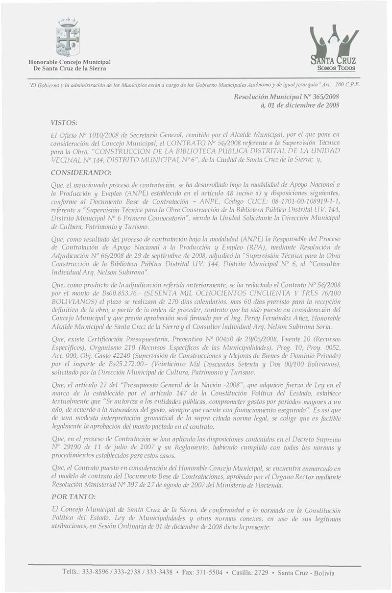 Aprueba el Contrato Nº 56/2008 de 20 de octubre de 2008, por el valor de Bs. 60.853.76 (SESENTA MIL OCHOCIENTOS CINCUENTA Y TRES 76/100 BOLIVIANOS), para la “SUPERVISIÓN TÉCNICA DE OBRA REFERENTE A LA CONSTRUCCIÓN DE LA BIBLIOTECA PÚBLICA DISTRITAL UNIDAD VECINAL Nº 144, DISTRITO MUNICIPAL Nº 6, DE LA CIUDAD DE SANTA CRUZ DE LA SIERRA” a suscribirse entre el Consultor Individual Arq. Nelson Subirana Soria.