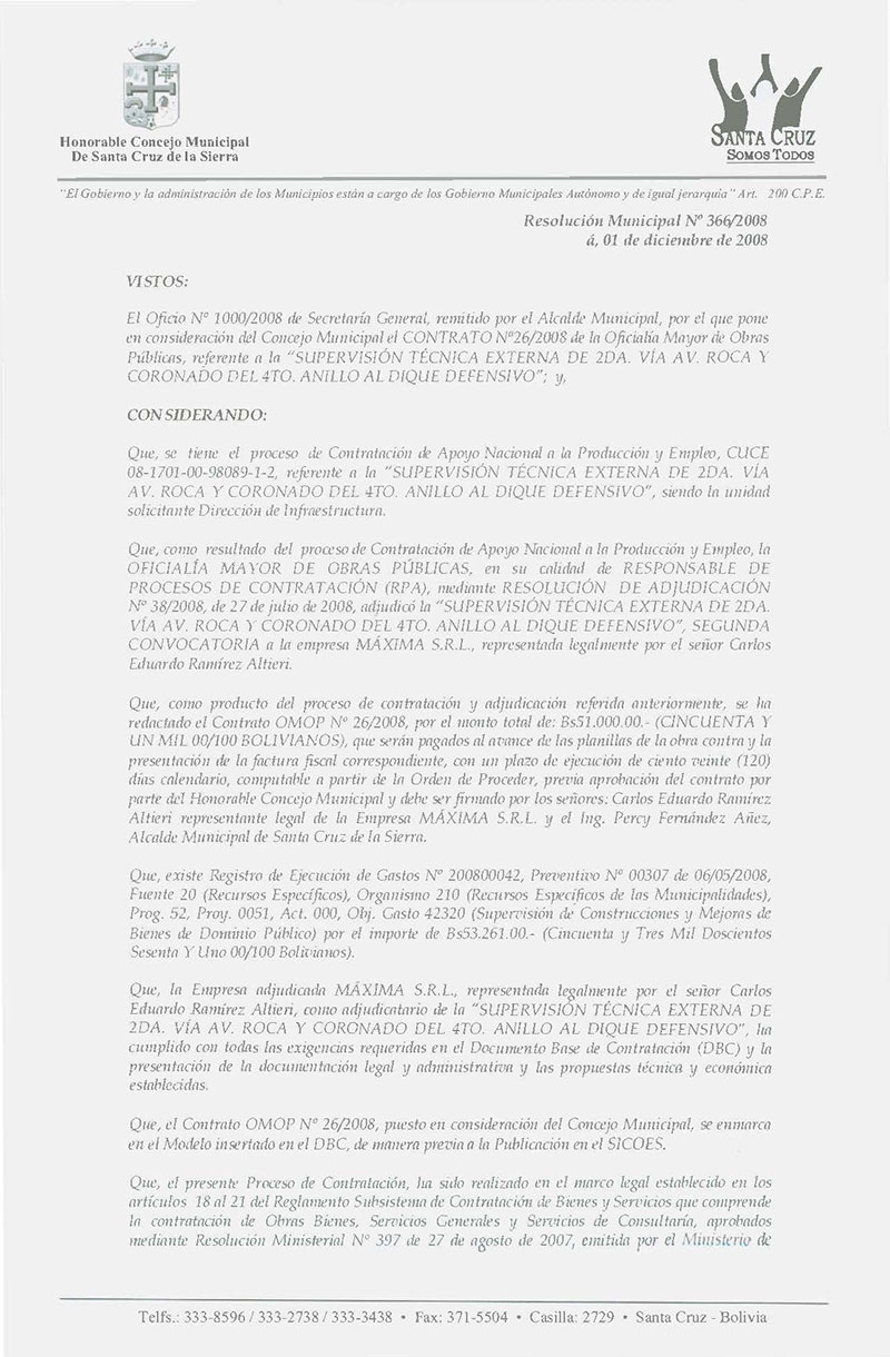 Aprueba el Contrato Nº 26/2008 de la Oficialía Mayor de Obras Públicas, por el monto total de Bs. 51.000.00 (CINCUENTA Y UN MIL 00/100 BOLIVIANOS), para la “SUPERVISIÓN TÉCNICA EXTERNA DE 2DA VÍA AV. ROCA Y CORONADO DEL 4° ANILLO AL DIQUE DEFENSIVO”, a suscribirse con la Empresa MÁXIMA S.R.L.