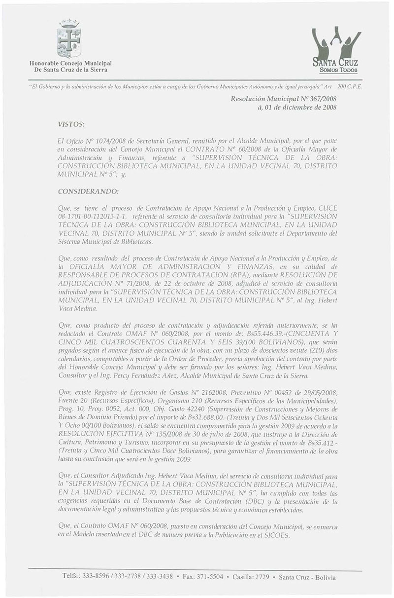 Aprueba el Contrato Nº 060/2008 de la Oficialía Mayor de Administración y Finanzas, por el monto de Bs. 55.446.39 (CINCUENTA Y CINCO MIL CUATROCIENTOS CUARENTA Y SEIS 39/100 BOLIVIANOS), para el servicio de consultoría individual de la “SUPERVISIÓN TÉCNICA DE LA OBRA CONSTRUCCIÓN BIBLIOTECA MUNICIPAL, EN LA UNIDAD VECINAL 70, DISTRITO MUNICIPAL Nº 5” a suscribirse con el Ing. Hebert Vaca Medina Consultor.