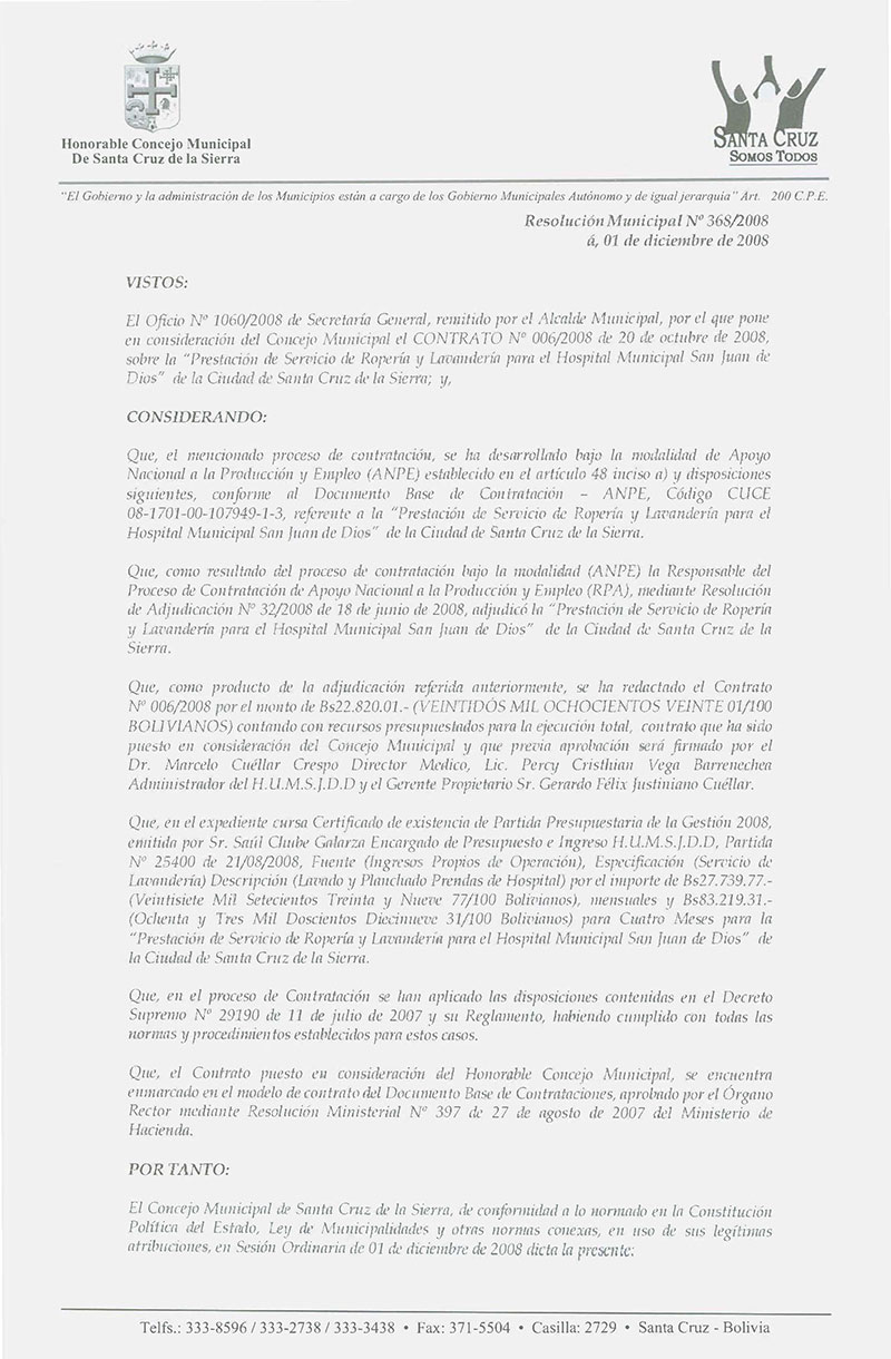 Aprueba el Contrato Nº 006/2008, por el valor mensual de Bs 22.820.01.- (VEINTIDÓS MIL OCHOCIENTOS VEINTE 01/100 BOLIVIANOS), para el Servicio de Ropería y Lavandería para el Hospital Universitario San Juan de Dios adjudicado a la “la Empresa Diamantes y Servicios y Limpieza”.