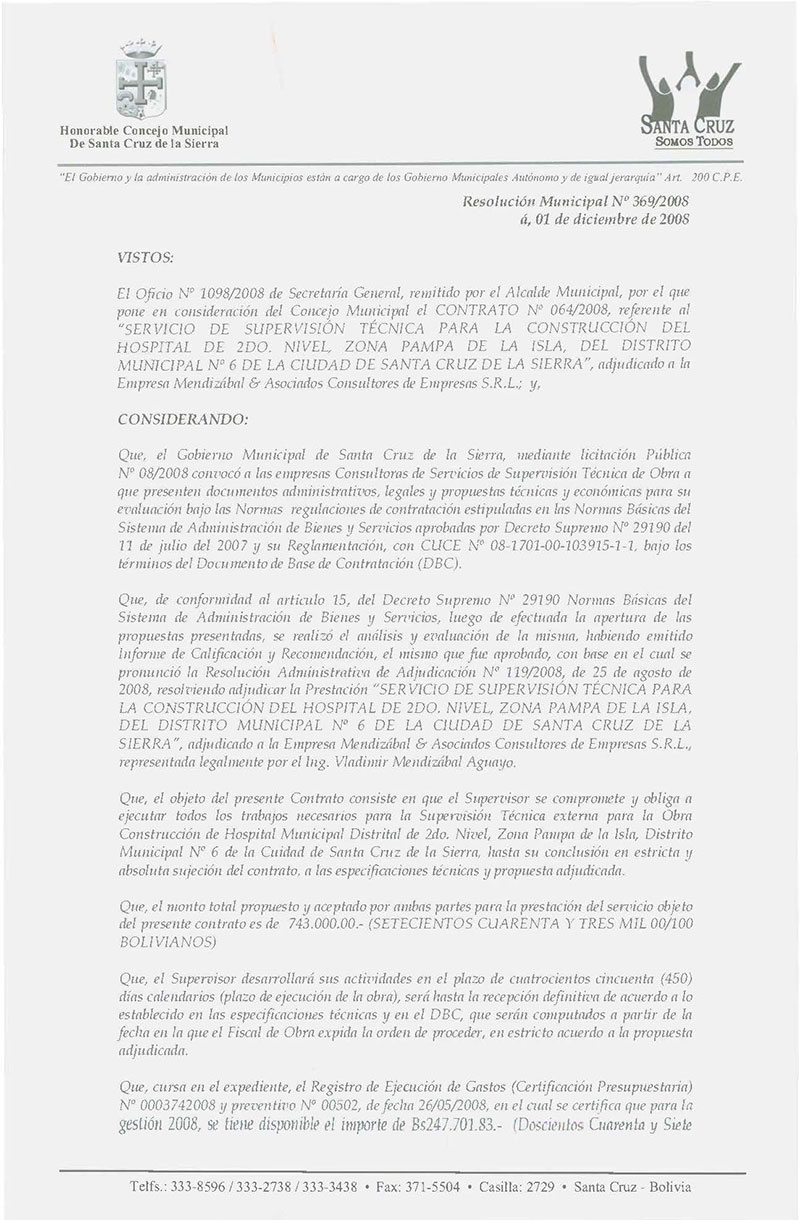 Aprueba el CONTRATO Nº 064/2008, referente al “SERVICIO DE SUPERVISIÓN TÉCNICA PARA LA CONSTRUCCIÓN DEL HOSPITAL DE 2° NIVEL, ZONA PAMPA DE LA ISLA, DEL DISTRITO MUNICIPAL Nº 6 DE LA CIUDAD DE SANTA CRUZ DE LA SIERRA”, por el monto de 743.000.00.- (SETECIENTOS CUARENTA Y TRES MIL 00/100 BOLIVIANOS), adjudicado a la Empresa Mendizábal.