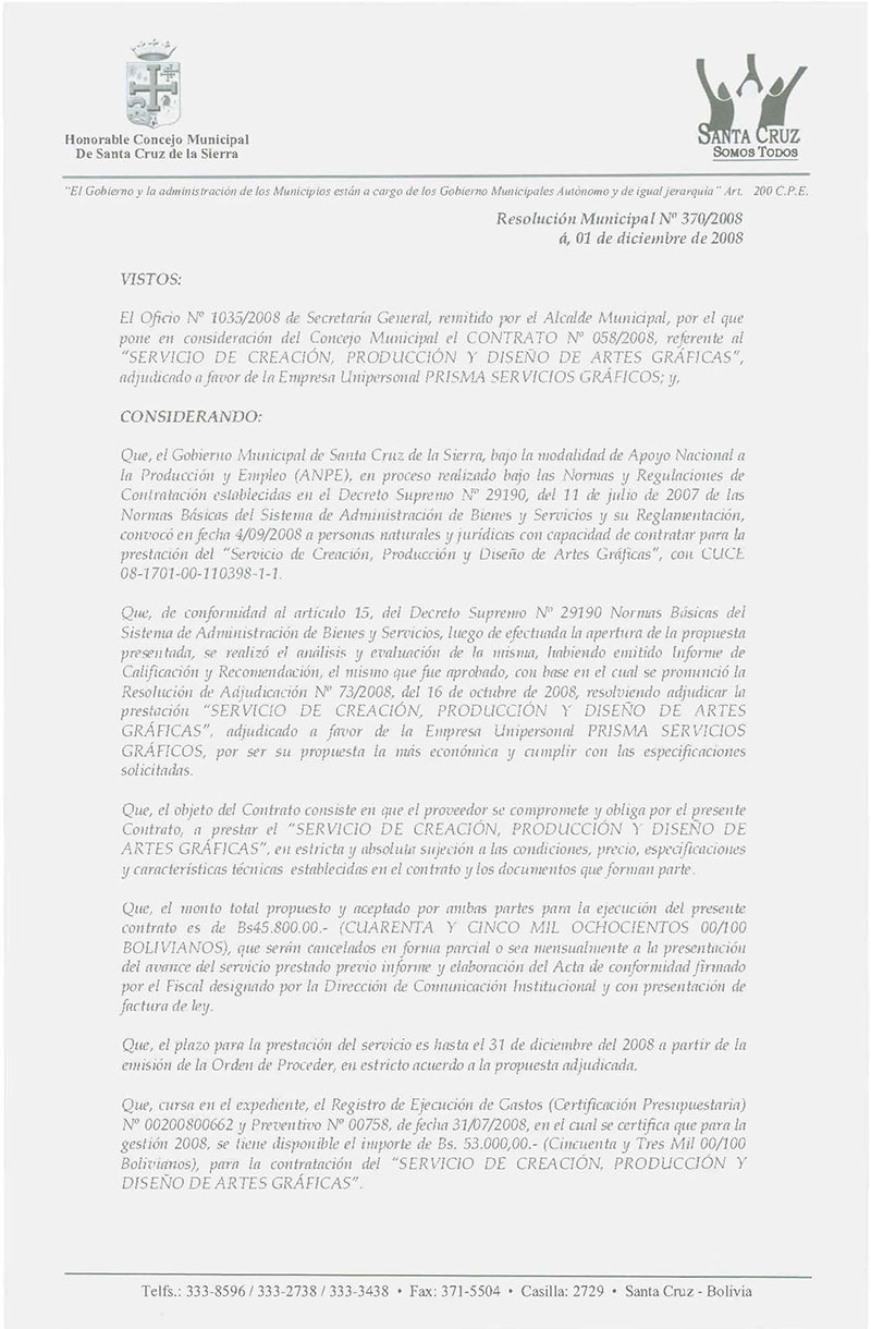 Aprueba el Contrato Nº 58/2008, referente al “SERVICIO DE CREACIÓN, PRODUCCIÓN Y DISEÑO DE ARTES GRÁFICAS”, por el monto de Bs. 45.800.00 (CUARENTA Y CINCO MIL OCHOCIENTOS 00/100 BOLIVIANOS), adjudicado a la Empresa Unipersonal PRISMA SERVICIOS GRÁFICOS.