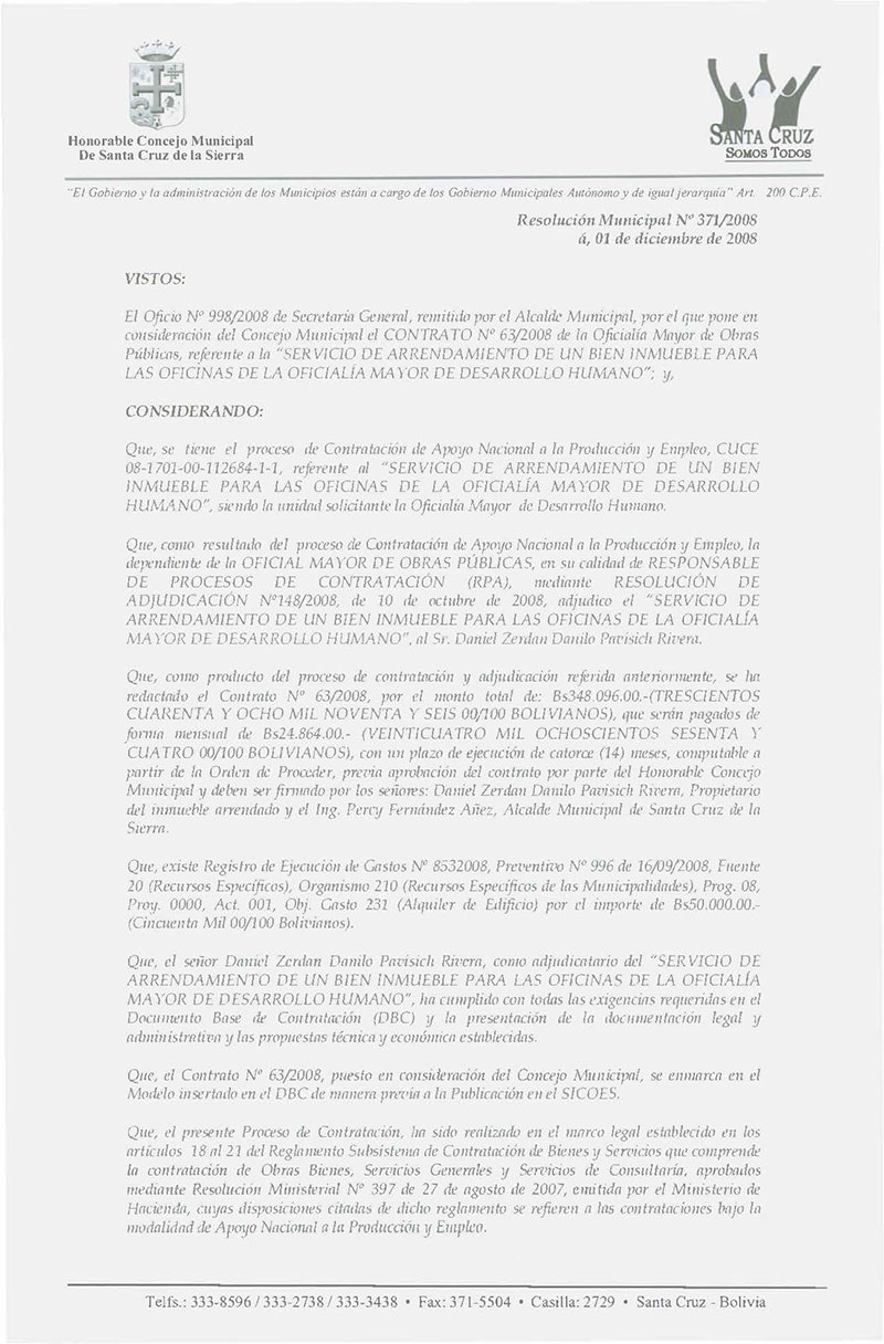 Aprueba el Contrato Nº 63/2008 de la Oficialía Mayor de Obras Públicas, por el monto total de Bs. 348.096.00.- (TRESCIENTOS CUARENTA Y OCHO MIL NOVENTA Y SEIS 00/100 BOLIVIANOS), para el “SERVICIO DE ARRENDAMIENTO DE UN BIEN INMUEBLE PARA LAS OFICINAS DE LA OFICIALÍA MAYOR DE DESARROLLO HUMANO” a suscribirse con los Srs Daniel Zerdan, Danilo Pavisichs Rivera.