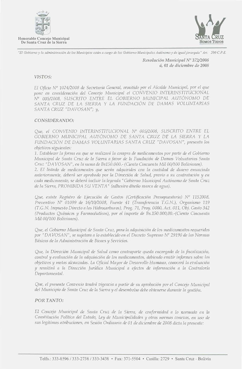 Aprueba el “CONVENIO INTERINSTITUCIONAL Nº 005/2008”, a suscribirse entre la Fundación de Damas Voluntarias Santa Cruz "DAVOSAN" y el Gobierno Municipal de Santa Cruz de la Sierra.