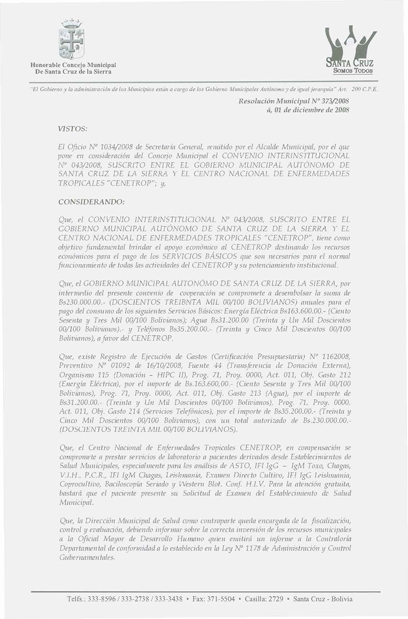 Aprueba el “CONVENIO INTERINSTITUCIONAL Nº 043/2008”, con un monto comprometido por el GOBIERNO MUNICIPAL AUTÓNOMO DE SANTA CRUZ DE LA SIERRA de Bs. 230.000.00.- (DOSCIENTOS TREINTA MIL 00/100 BOLIVIANOS), con el CENTRO NACIONAL DE ENFERMEDADES TROPICALES “CENETROP”.