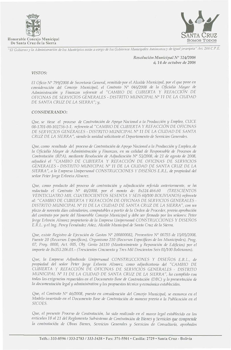 Aprueba el Contrato Nº 46/2008, por el monto de Bs. 324.466.60.- (TRESCIENTOS VEINTICUATRO MIL CUATROCIENTOS SESENTA Y SEIS 60/100 BOLIVIANOS) referente al “CAMBIO DE CUBIERTA Y REFACCIÓN DE OFICINAS DE SERVICIOS GENERALES - DISTRITO MUNICIPAL Nº 11 DE LA CIUDAD DE SANTA CRUZ DE LA SIERRA”, suscrito con la Empresa Unipersonal CONSTRUCCIONES Y DISEÑOS E.R.L.