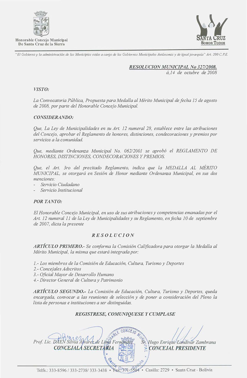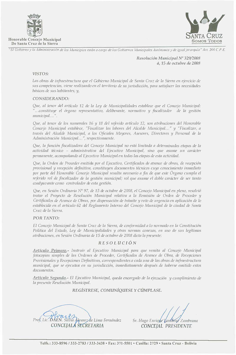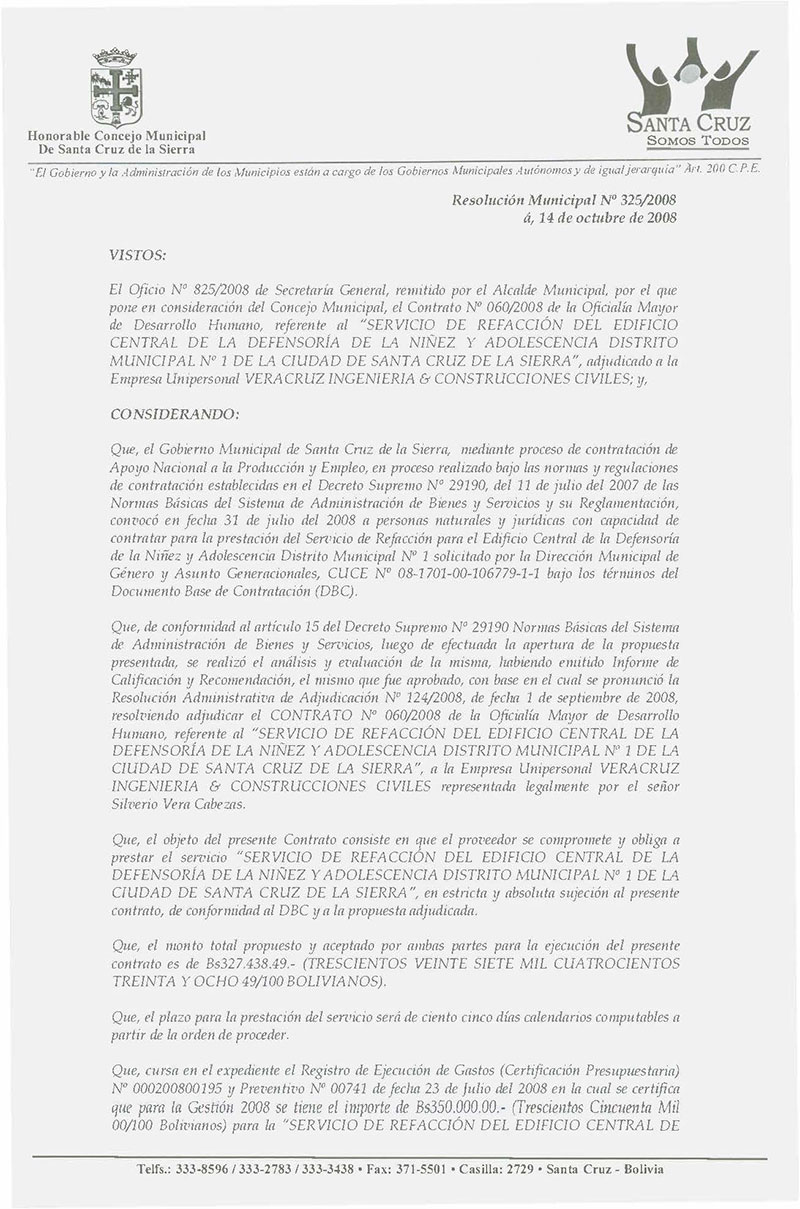 Aprueba el Contrato Nº 060/2008 de la Oficialía Mayor de Desarrollo Humano, referente al “SERVICIO DE REFACCIÓN DEL EDIFICIO CENTRAL DE LA DEFENSORÍA DE LA NIÑEZ Y ADOLESCENCIA DISTRITO MUNICIPAL Nº 1 DE LA CIUDAD DE SANTA CRUZ DE LA SIERRA”, adjudicado a la Empresa Unipersonal VERACRUZ INGENIERÍA.