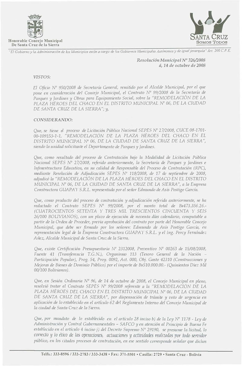 Aprueba el Contrato Nº 99/2008 de la Secretaría de Parques y Jardines y Obras para Equipamiento Social, por el monto total de Bs. 473.356.26.- (CUATROCIENTOS SETENTA Y TRES MIL TRESCIENTOS CINCUENTA Y SEIS 26/100 BOLIVIANOS), para la “REMODELACIÓN DE LA PLAZA HÉROES DEL CHACO EN EL DISTRITO MUNICIPAL Nº 06, DE LA CIUDAD DE SANTA CRUZ DE LA SIERRA”, a suscribirse con la Empresa Constructora GUAPAY S.R.L.