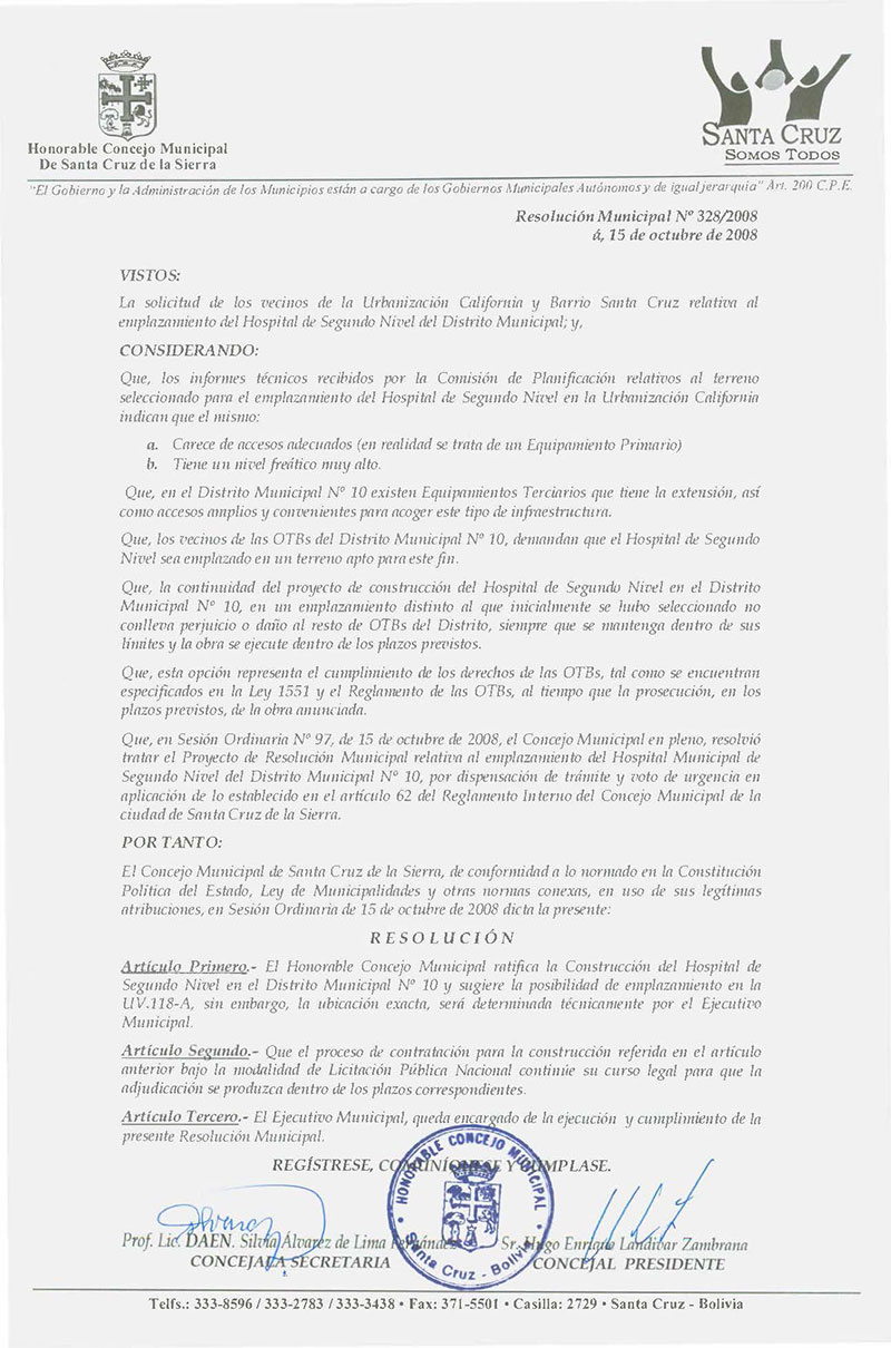 Ratifica la Construcción del Hospital de Segundo Nivel en el Distrito Municipal Nº 10 y sugiere la posibilidad de emplazamiento en la UV.118-A, sin embargo, la ubicación exacta, será determinada técnicamente por el Ejecutivo Municipal.