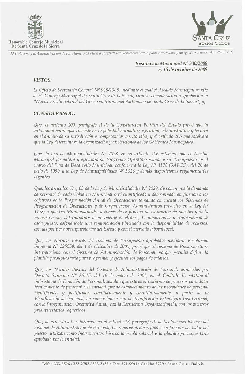 Aprueba la nueva Escala Salarial del Gobierno Municipal de Santa Cruz de la Sierra, con las modificaciones y ajustes efectuados en los niveles y montos de haberes básicos que se detallan en el siguiente cuadro, la misma que deberá ser aplicada a partir del mes de septiembre de 2008.