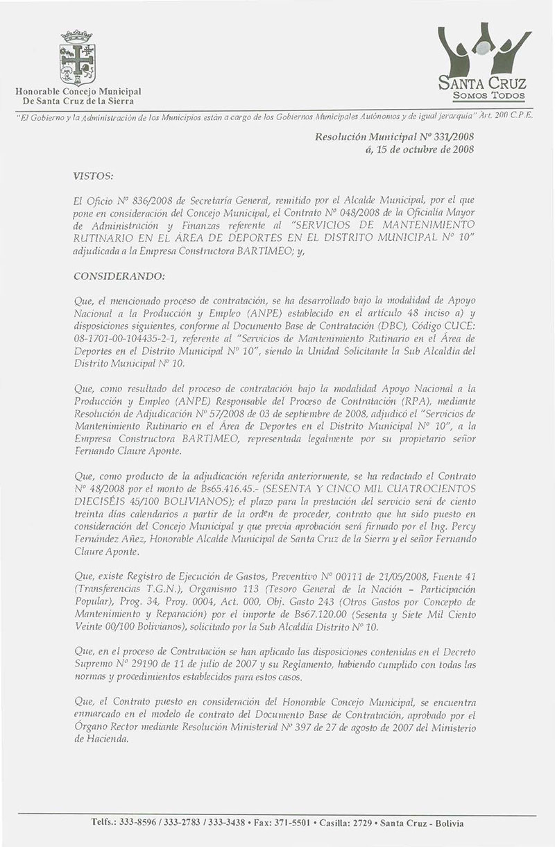 Aprueba el Contrato Nº 48/2008 de 10 de septiembre de 2008, por el valor de Bs. 65.416.45.- (SESENTA Y CINCO MIL CUATROCIENTOS DIECISÉIS 45/100 BOLIVIANOS), para el “Servicios de Mantenimiento Rutinario en el Área de Deportes en el Distrito Municipal Nº 10” adjudicado a la Empresa Constructora BARTIMEO.