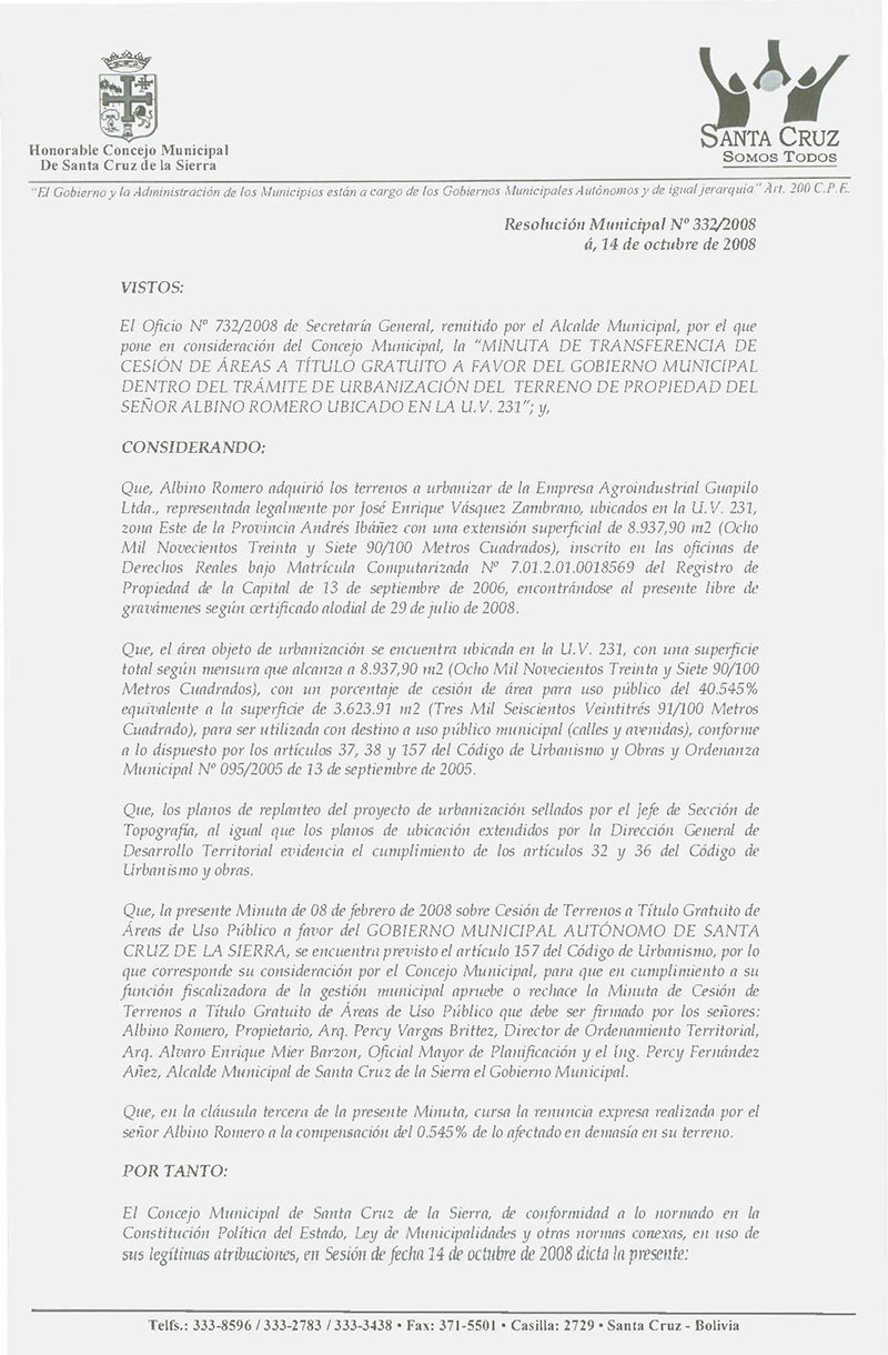 Aprueba la “MINUTA DE TRANSFERENCIA DE CESIÓN DE ÁREAS A TÍTULO GRATUITO A FAVOR DEL GOBIERNO MUNICIPAL DENTRO DEL TRÁMITE DE URBANIZACIÓN DEL TERRENO DE PROPIEDAD DEL SEÑOR ALBINO ROMERO UBICADO EN LA U.V. 231” que realiza el señor Albino Romero, propietario, a favor del Gobierno Municipal de Santa Cruz de la Sierra, ubicados en la U.V. 231, zona Este de la Provincia Andrés Ibáñez, los mismos serán destinados para uso público municipal (calles y avenidas).