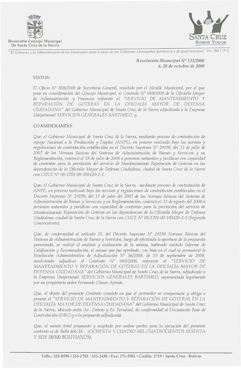 Aprueba el Contrato Nº 049/2008, referente al “SERVICIO DE MANTENIMIENTO Y REPARACIÓN DE GOTERAS EN LA OFICIALÍA MAYOR DE DEFENSA CIUDADANA” del Gobierno Municipal de Santa Cruz de la Sierra, adjudicado a la Empresa Unipersonal SERVICIOS GENERALES BARTIMEO, por un monto de de Bs. 84.466.38.- (OCHENTA Y CUATRO MIL CUATROCIENTOS SESENTA Y SEIS 38/100 BOLIVIANOS).