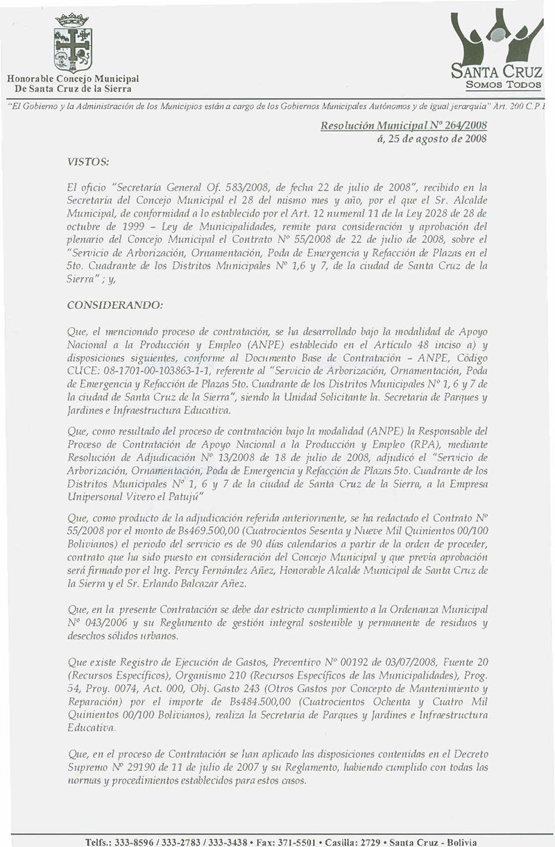 Aprueba el Contrato Nº 55/2008 de 22 de julio de 2008, por el valor de Bs. 469.500,00 (Cuatrocientos Sesenta y Nueve Mil Quinientos 00/100 Bolivianos), para el “Servicio de Arborización, Ornamentación, Poda de Emergencia y Refacción de Plazas en el 5° Cuadrante de los Distritos Municipales Nº 1, 6 y 7, de la ciudad de Santa Cruz de la Sierra” adjudicado a la Empresa Unipersonal Vivero el Patujú.