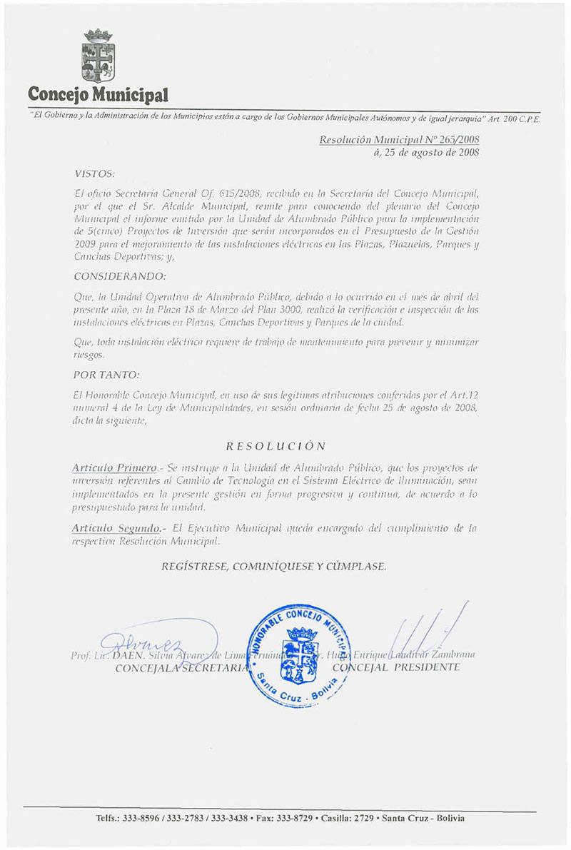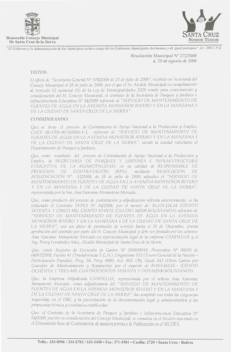 Aprueba el Contrato de la Secretaría de Parques y Jardines e Infraestructura Educativa Nº 54/2008, por el monto de Bs. 175.124.34 (CIENTO SETENTA Y CINCO MIL CIENTO VEINTICUATRO 34/100 BOLIVIANOS) para el “SERVICIO DE MANTENIMIENTO DE FUENTES DE AGUA EN LA AVENIDA MONSEÑOR RIVERO Y EN LA MANZANA 1 DE LA CIUDAD DE SANTA CRUZ DE LA SIERRA”, a suscribirse con la Empresa CANDELUX.