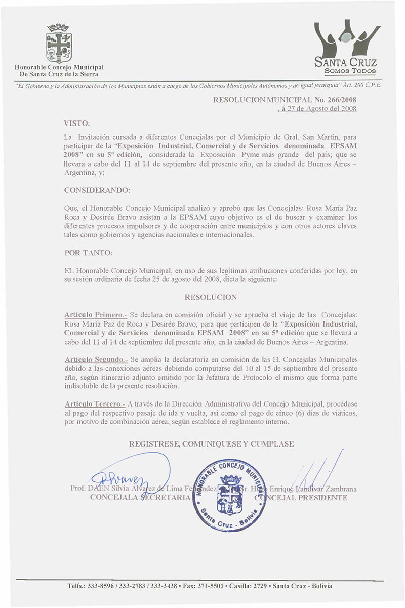 Declara en Comisión Oficial y se aprueba el viaje de las Concejalas Rosa Maria Paz de Roca y Desirée Bravo, para que participen de la "Exposición Industrial Comercial y de Servicio, denominada EPSAM 2008" en su 5ta Edición que se llevará a cabo del 11 al 14 de septiembre del presente año en la ciudad de Buenos Aires - Argentina.