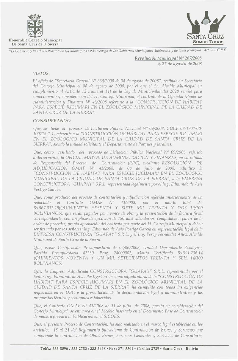 Aprueba el Contrato OMAF Nº 43/2008, por el monto total de Bs. 567.032.19 (QUINIENTOS SESENTA Y SIETE MIL TREINTA Y DOS 19/100 BOLIVIANOS), para la “CONSTRUCCIÓN DE HÁBITAT PARA ESPECIE JUCUMARI EN EL ZOOLÓGICO MUNICIPAL DE LA CIUDAD”, suscrito con la EMPRESA CONSTRUCTORA “GUAPAY” S.R.L.
