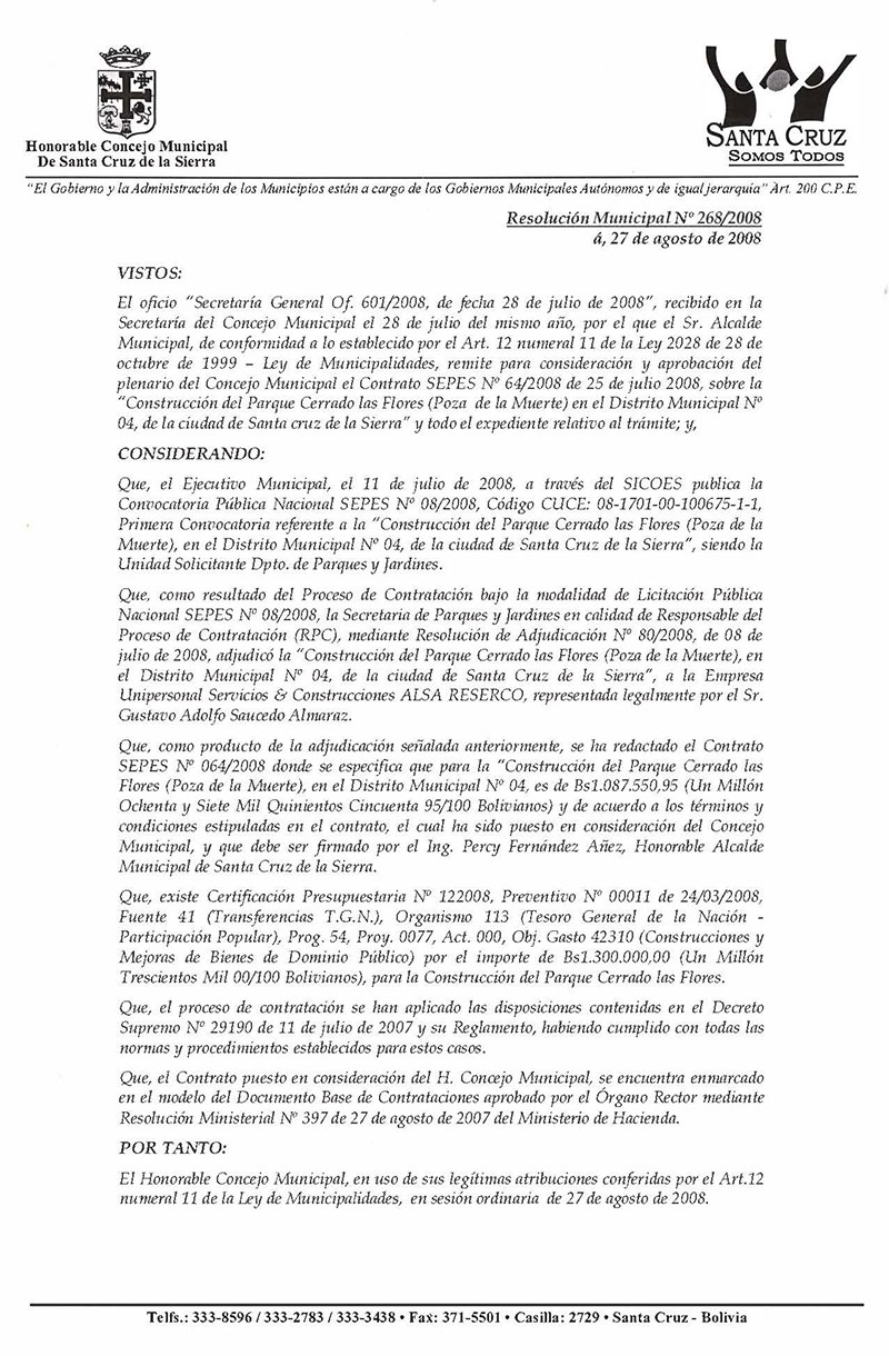 Se aprueba el Contrato SEPES Nº 064/2008 de 25 de julio de 2008, por el monto de Bs1.087.550,95 (Un Millón Ochenta y Siete Mil Quinientos Cincuenta 95/100 Bolivianos), para la “Construcción del Parque Cerrado las Flores (Poza de la Muerte), en el Distrito Municipal Nº 04”, adjudicado a la Empresa Unipersonal Servicios & Construcciones ALSA RESERCO.