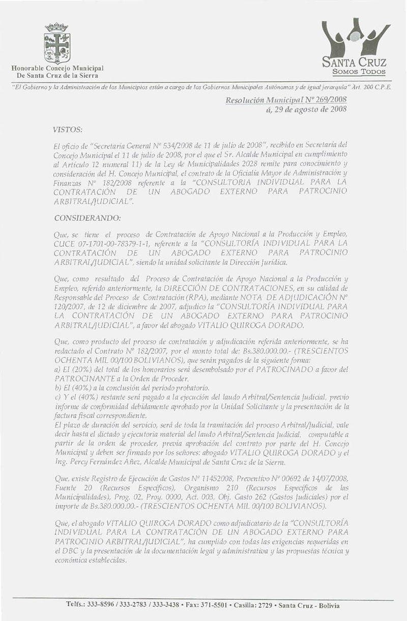 Aprueba el Contrato de la Oficialía Mayor de Administración y Finanzas Nº 182/2007, por el monto total de Bs. 380.000.00.- (TRESCIENTOS OCHENTA MIL 00/100 BOLIVIANOS), para la “CONSULTORIA INDIVIDUAL PARA LA CONTRATACIÓN DE UN ABOGADO EXTERNO PARA PATROCINIO ARBITRAL/JUDICIAL” a suscribirse con el abogado Vitalio Quiroga Dorado.