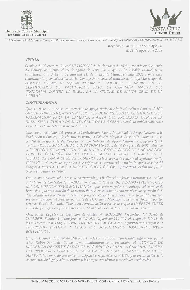 Aprueba el Contrato de la Oficialía Mayor de Desarrollo Humano Nº 55/2008, por el monto total de Bs. 28.500.00.- (Veintiocho Mil Quinientos 00/100 Bolivianos), para el “SERVICIO DE IMPRESIÓN DE CERTIFICADOS DE VACUNACIÓN PARA LA CAMPAÑA MASIVA DEL PROGRAMA CONTRA LA RABIA EN LA CIUDAD DE SANTA CRUZ DE LA SIERRA” a suscribirse con la Empresa IMPRETA SUPER COLOR.