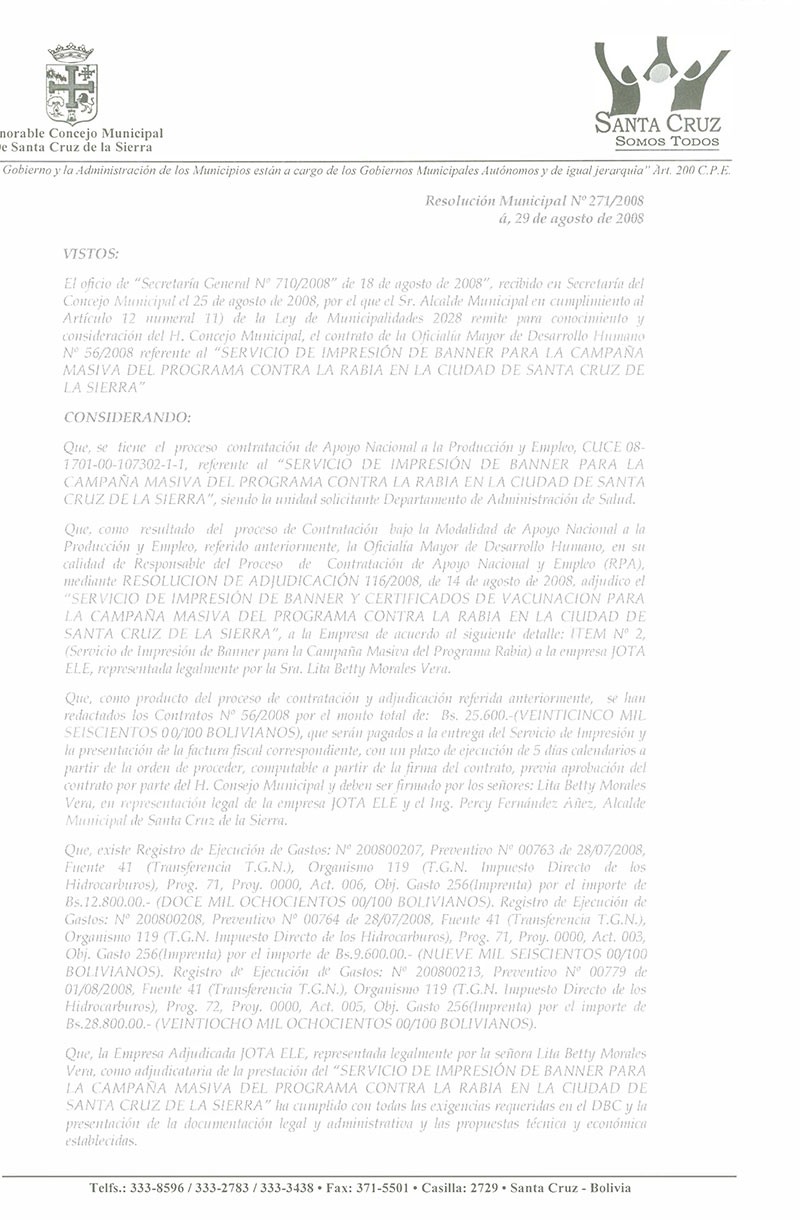 Aprueba el Contrato de la Oficialía Mayor de Desarrollo Humano Nº 056/2008 por el monto total de Bs. 25.600.00 (VEINTICINCO MIL SEISCIENTOS 00/100 BOLIVIANOS), para el “SERVICIO DE IMPRESIÓN DE BANNER PARA LA CAMPAÑA MASIVA DEL PROGRAMA CONTRA LA RABIA EN LA CIUDAD DE SANTA CRUZ DE LA SIERRA” a suscribirse con la empresa JOTA ELE.