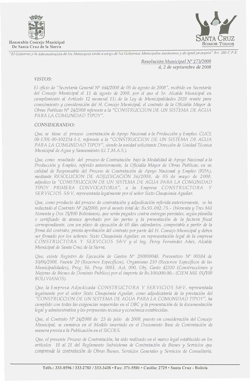 Aprueba el Contrato de la Oficialía Mayor de Obras Publicas Nº 24/2008, por el monto total de Bs. 93.092.75 (NOVENTA Y TRES MIL NOVENTA y DOS 75/100 BOLIVIANOS), para la “CONSTRUCCIÓN DE UN SISTEMA DE AGUA PARA LA COMUNIDAD TIPOY, CANTON PAURITO DISTRITO MUNICIPAL Nº 14” a suscribirse con la empresa CONSTRUCTORA Y SERVICIOS S.
