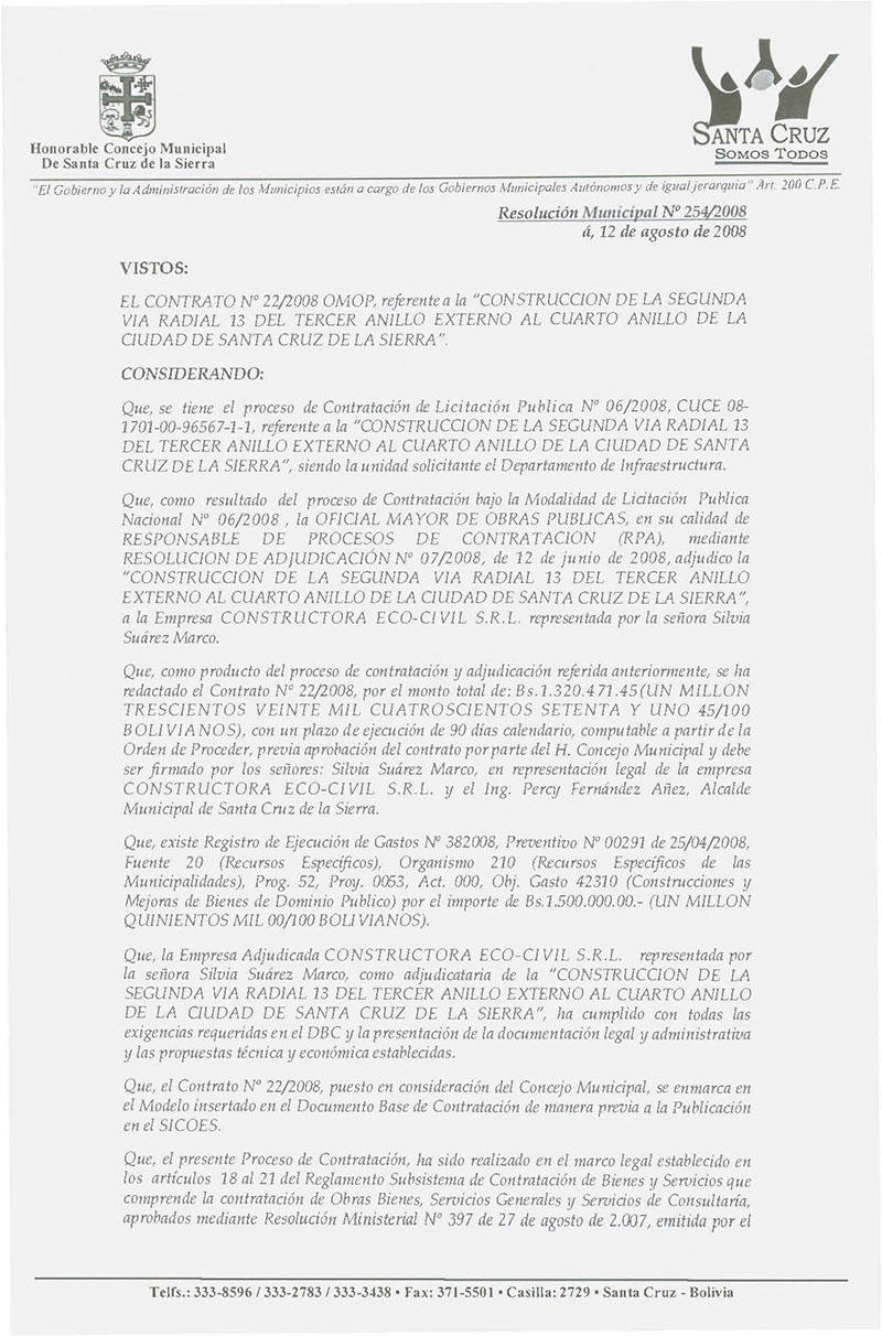 Aprueba el Contrato de la Oficialía Mayor de Obras Publicas Nº 22/2008, por el monto total de Bs. 1.320.471.45 (UN MILLÓN TRESCIENTOS VEINTE MIL CUATROCIENTOS SETENTA Y UNO 45/100 BOLIVIANOS), para la “CONSTRUCCIÓN DE LA SEGUNDA VÍA RADIAL 13 DEL TERCER ANILLO EXTERNO – CUARTO ANILLO DE LA CIUDAD DE SANTA CRUZ DE LA SIERRA”, suscrito con la CONSTRUCTORA DEL ORIENTE ECO-CIVIL S.R.L.