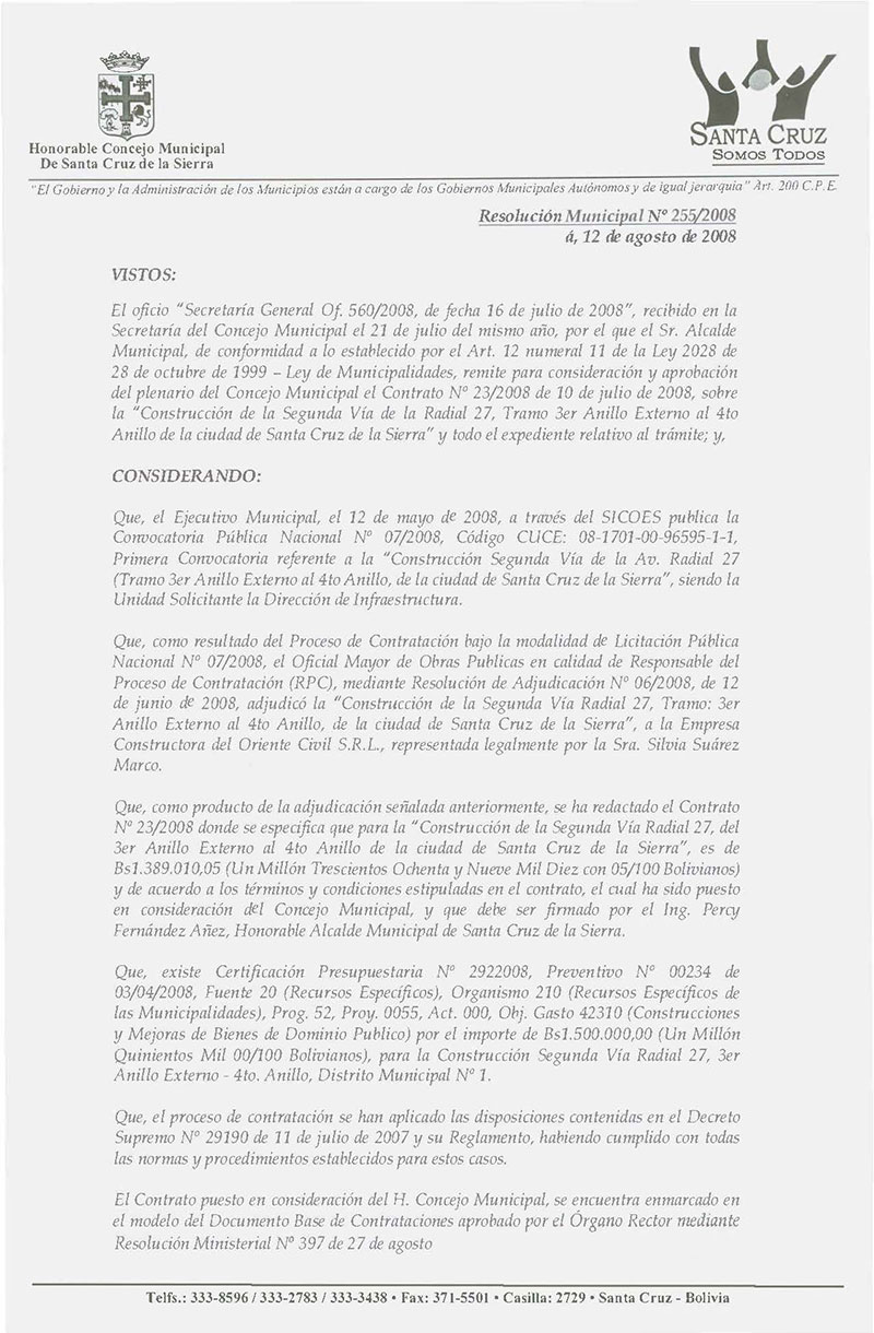 Aprueba el Contrato de la Oficialía Mayor de Obras Públicas Nº 23/2008, por el monto de Bs. 1.389.010.05 (UN MILLÓN TRESCIENTOS OCHENTA Y NUEVE MIL DIEZ 05/100 BOLIVIANOS), para la “Construcción Segunda Vía de la Av. Radial 27 Tramo 3er Anillo Externo al 4to. Anillo de la ciudad de Santa Cruz de la Sierra”, adjudicado a la “Empresa Constructora Eco Civil S.R.L.