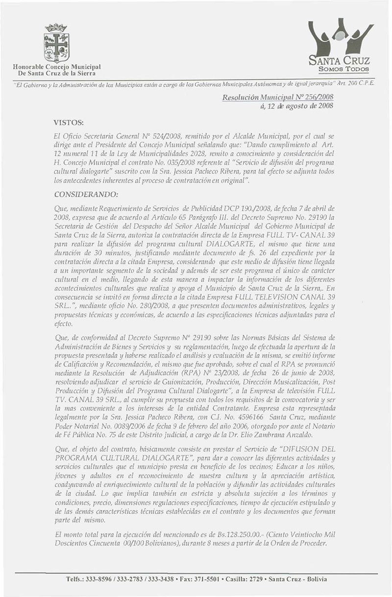 Aprueba el Contrato Nº 35/2008, referente al Servicio de “DIFUSIÓN DEL PROGRAMA CULTURAL DIALOGARTE”, adjudicado a la Empresa de “FULL TELEVISIÓN CANAL 39 SRL.”, por un monto de Bs. 128.250.00 (CIENTO VEINTIOCHO MIL DOSCIENTOS CINCUENTA 00/100 BOLIVIANOS).