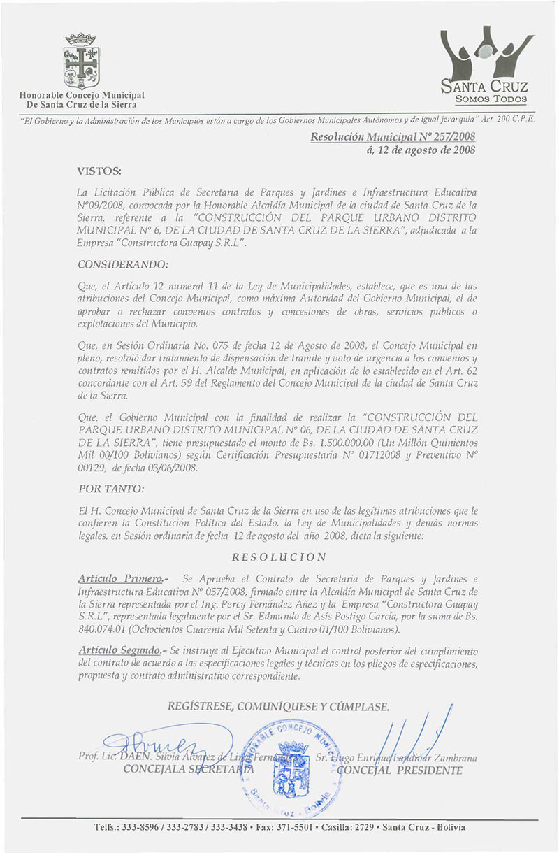 Aprueba el Contrato de Secretaria de Parques y Jardines e Infraestructura Educativa Nº 057/2008, para la Construcción del Parque Urbano Distrito Municipal N° 06 de la ciudad de Santa Cruz de la Sierra, adjudicada a la Empresa “Constructora Guapay S.R.L”, por la suma de Bs. 840.074.01 (OCHOCIENTOS CUARENTA MIL SETENTA Y CUATRO 01/100 BOLIVIANOS).