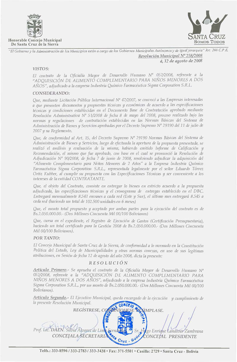 Aprueba el Contrato de la Oficialía Mayor de Desarrollo Humano Nº 052/2008, referente a la “ADQUISICIÓN DE ALIMENTO COMPLEMENTARIO PARA NIÑOS MENORES A DOS AÑOS”, adjudicado a la empresa Industria Químico Farmacéutica Sigma Corporation S.R.L., por un monto de Bs. 2.050.000.00.- (DOS MILLONES CINCUENTA MIL 00/100 BOLIVIANOS).