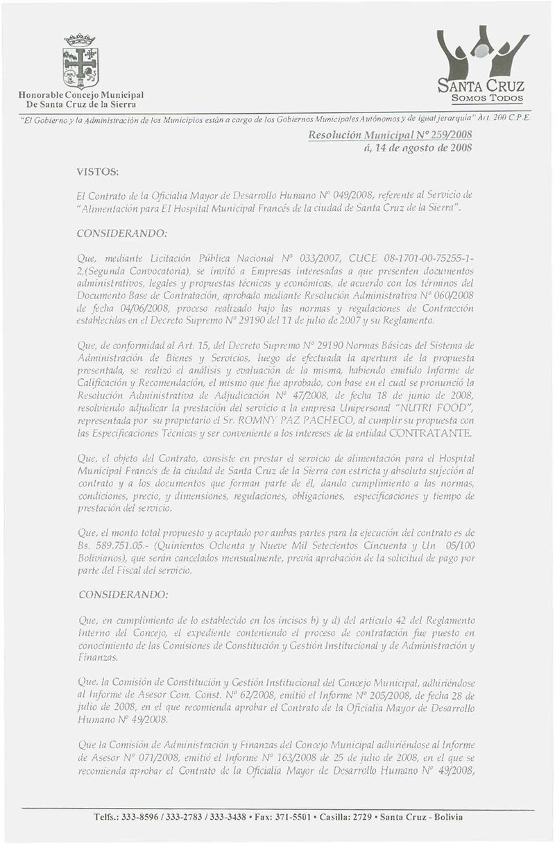 Rechaza el Contrato de la Oficialia Mayor de Desarrollo Humano Nº 49/2008, referente al Servicio de “Alimentación para El Hospital Municipal Francés de la ciudad de Santa Cruz de la Sierra”, adjudicado a la empresa Unipersonal “NUTRI FOOD”, por un monto de Bs. 589.751.05 (QUINIENTOS OCHENTA Y NUEVE MIL SETENCIENTOS CINCUENTA Y UNO 05/100 BOLIVIANOS).