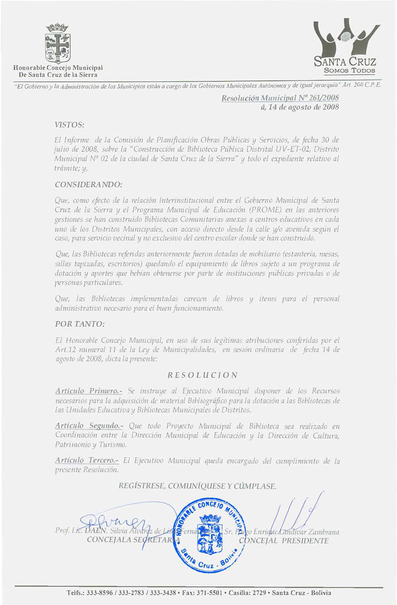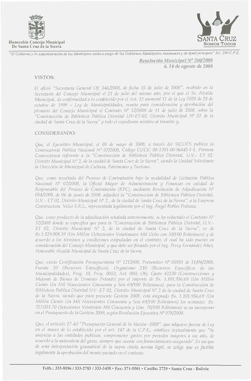 Aprueba el Contrato Nº 37/2008 de 11 de julio de 2008, por el monto total de Bs. 1.829.008,39 (UN MILLÓN OCHOCIENTOS VEINTINUEVE MIL OCHO 39/100 BOLIVIANOS), para la “Construcción de Biblioteca Pública Distrital UV-ET-02, Distrito Municipal Nº 02 de la ciudad de Santa Cruz de la Sierra”, adjudicado a la “Empresa Constructora y de Servicios Velco S.R.L.”.