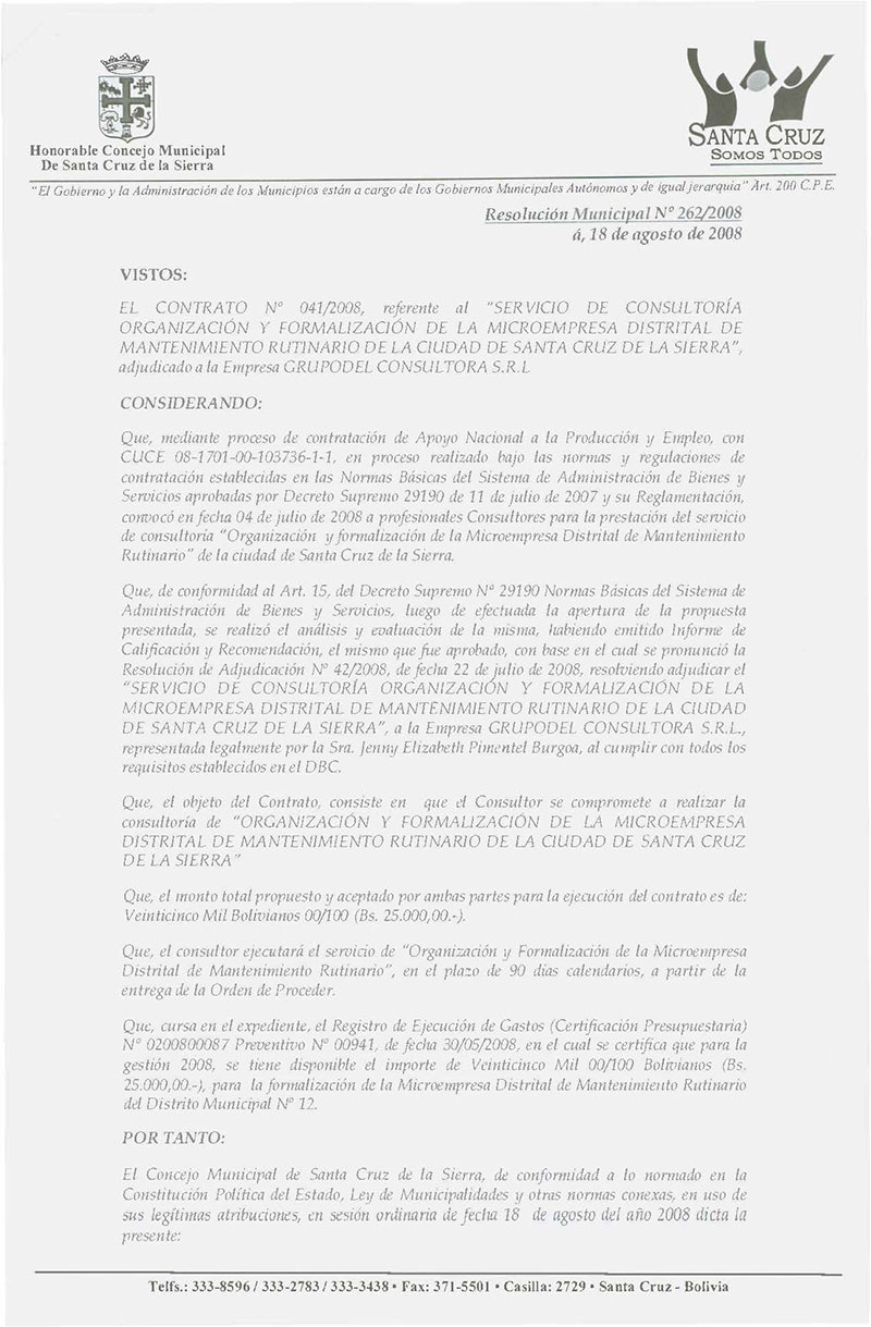 Aprueba el Contrato Nº 041/2008, referente al SERVICIO DE CONSULTORIA ORGANIZACIÓN Y FORMALIZACIÓN DE LA MICROEMPRESA DISTRITAL DE MANTENIMIENTO RUTINARIO DE LA CIUDAD DE SANTA CRUZ DE LA SIERRA, adjudicado a la EMPRESA GRUPO DEL CONSULTORA SRL.
