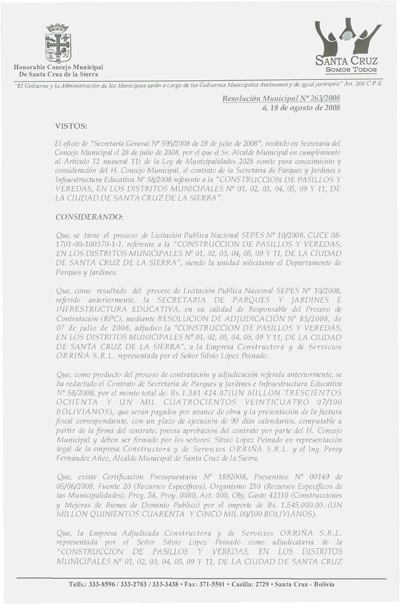 Aprueba el Contrato de la Secretaria de Parques y Jardines e Infraestructura Educativa Nº 58/2008, por el monto total de Bs. 1.381.424.07(UN MILLÓN TRESCIENTOS OCHENTA Y UN MIL CUATROCIENTOS VEINTICUATRO 07/100 BOLIVIANOS), para la “CONSTRUCCIÓN DE PASILLOS Y VEREDAS, EN LOS DISTRITOS MUNICIPALES Nº 01, 02, 03, 04, 05, 09 y 11, DE LA CIUDAD DE SANTA CRUZ DE LA SIERRA” , suscrito con la empresa Constructora y de Servicios ORRIÑA S.R.L.