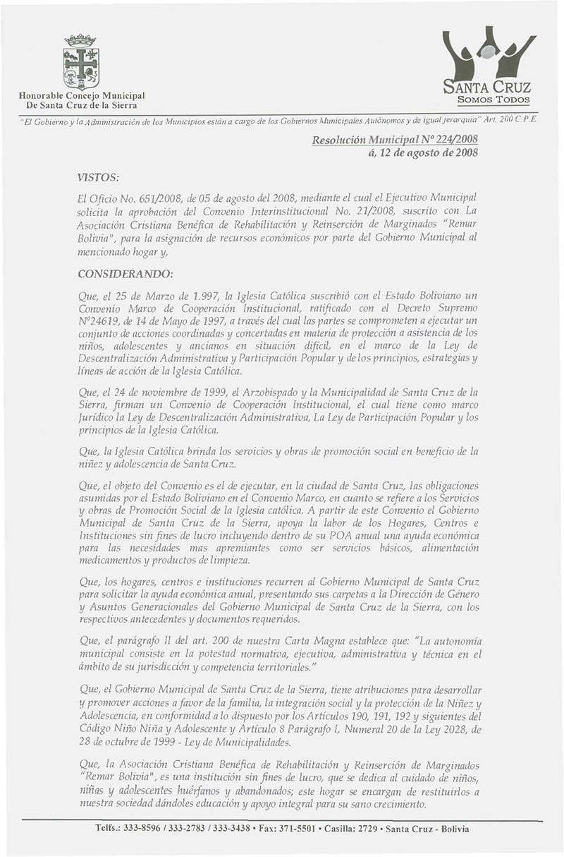 Aprueba el Convenio Interinstitucional Nº 21/2008, suscrito entre el Gobierno Municipal de la Ciudad de Santa Cruz de la Sierra y la Asociación Cristiana Benéfica de Rehabilitación y Reinserción de Marginados “Remar Bolivia", en beneficio de los Niños y Niñas y Adolescentes del referido Hogar.