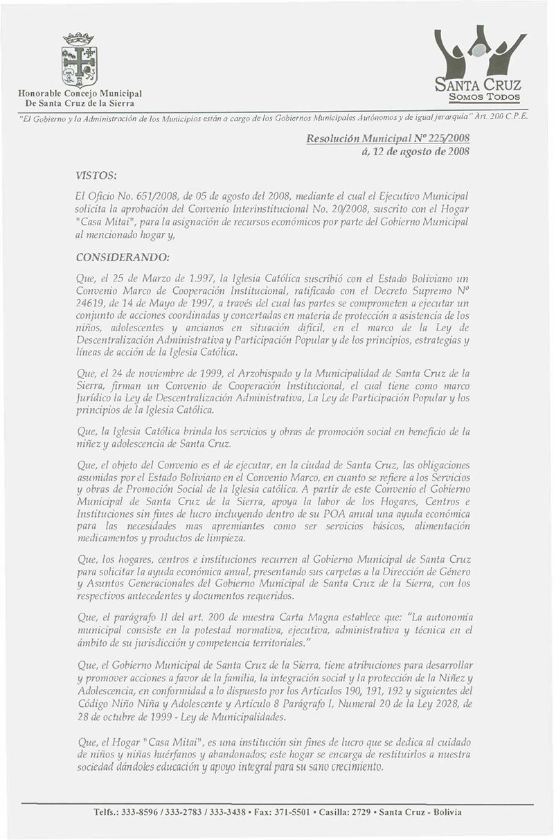Aprueba el Convenio Interinstitucional Nº 20/2008, suscrito entre el Gobierno Municipal de la Ciudad de Santa Cruz de la Sierra y el Hogar "Casa Mitai", en beneficio de los Niños y Niñas y Adolescentes del referido Hogar.